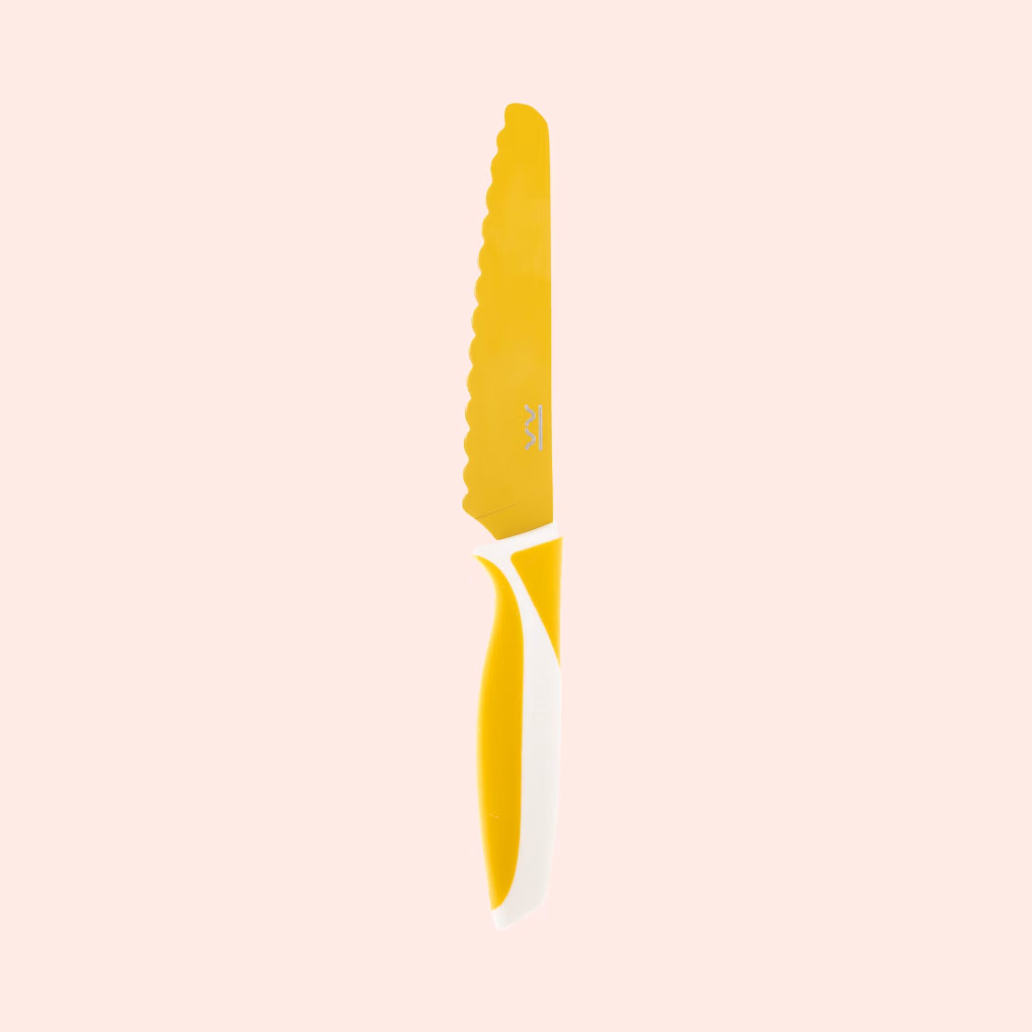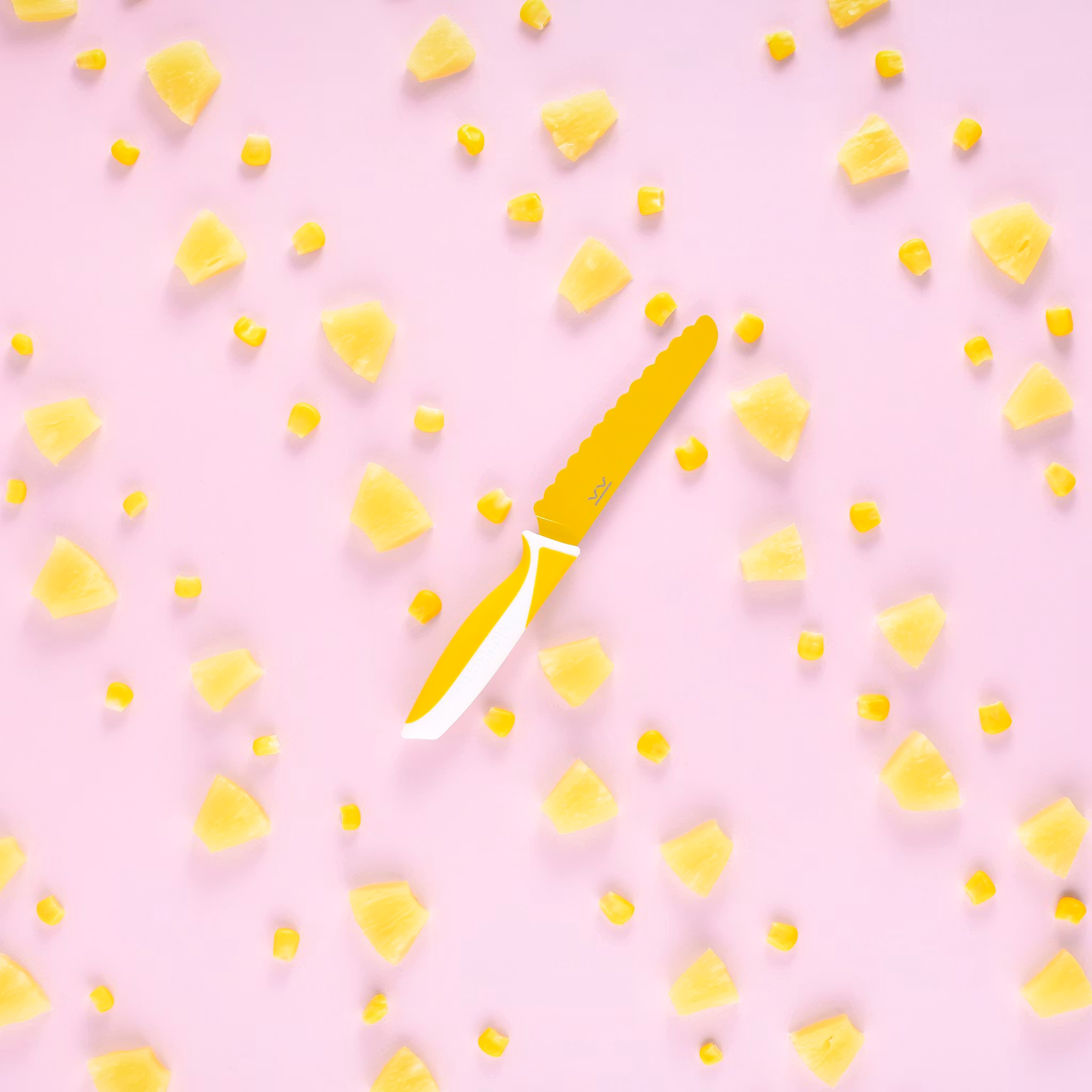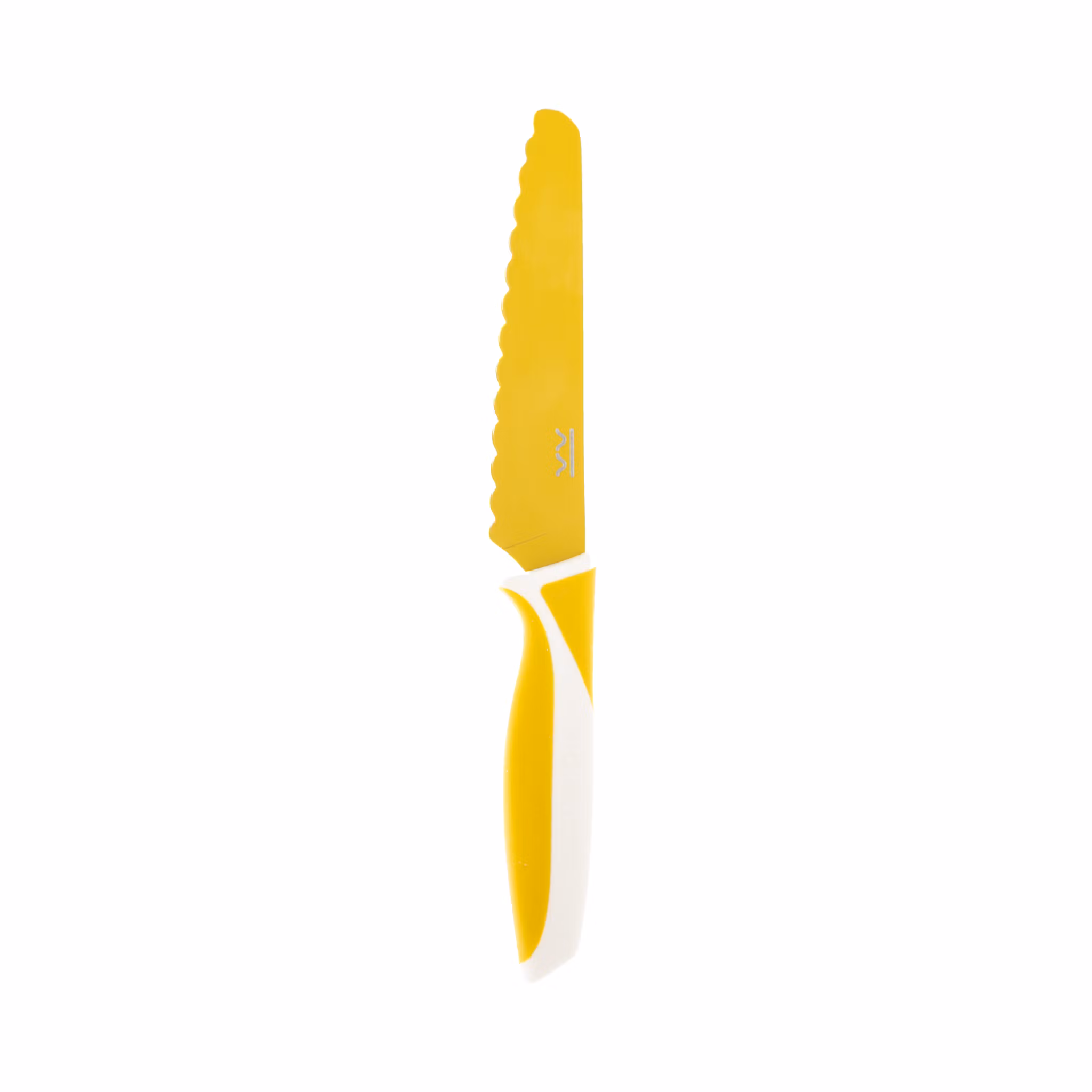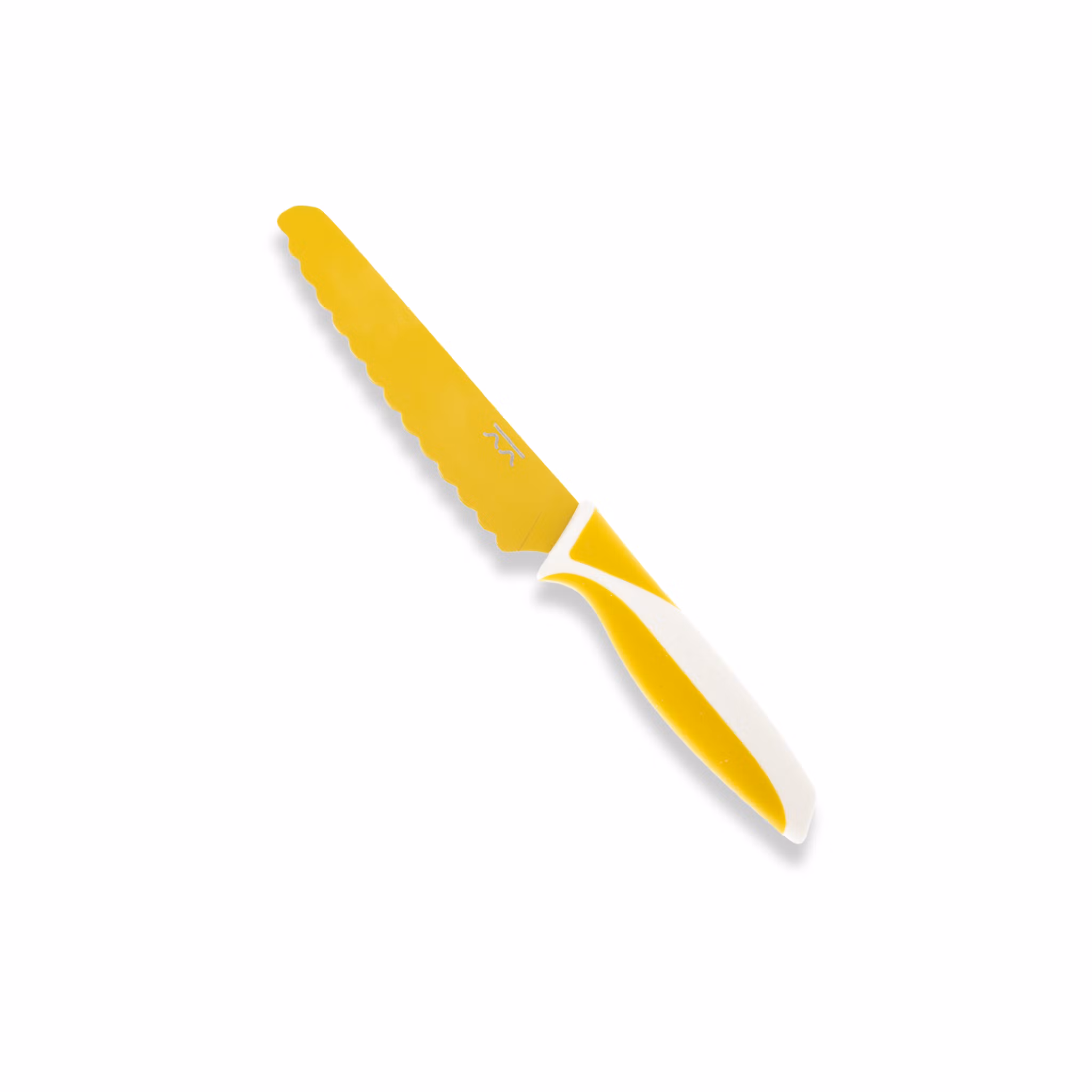 Unik barnkniv som liknar en vanlig vuxenkniv men med den stora skillnaden att den är anpassad i storlek till barn och att den inte går att skära sig på. Kiddikutter är en barnvänlig kökskniv designad för barn som vill hjälpa till med matlagningen. Tack vare sitt unika patenterade blad med rundade tandningar skär kniven effektivt genom mat med en sågrörelse som bibehåller kontakten med matens yta vilket minskar ansträngningen som krävs för att skiva, tärna och hacka.