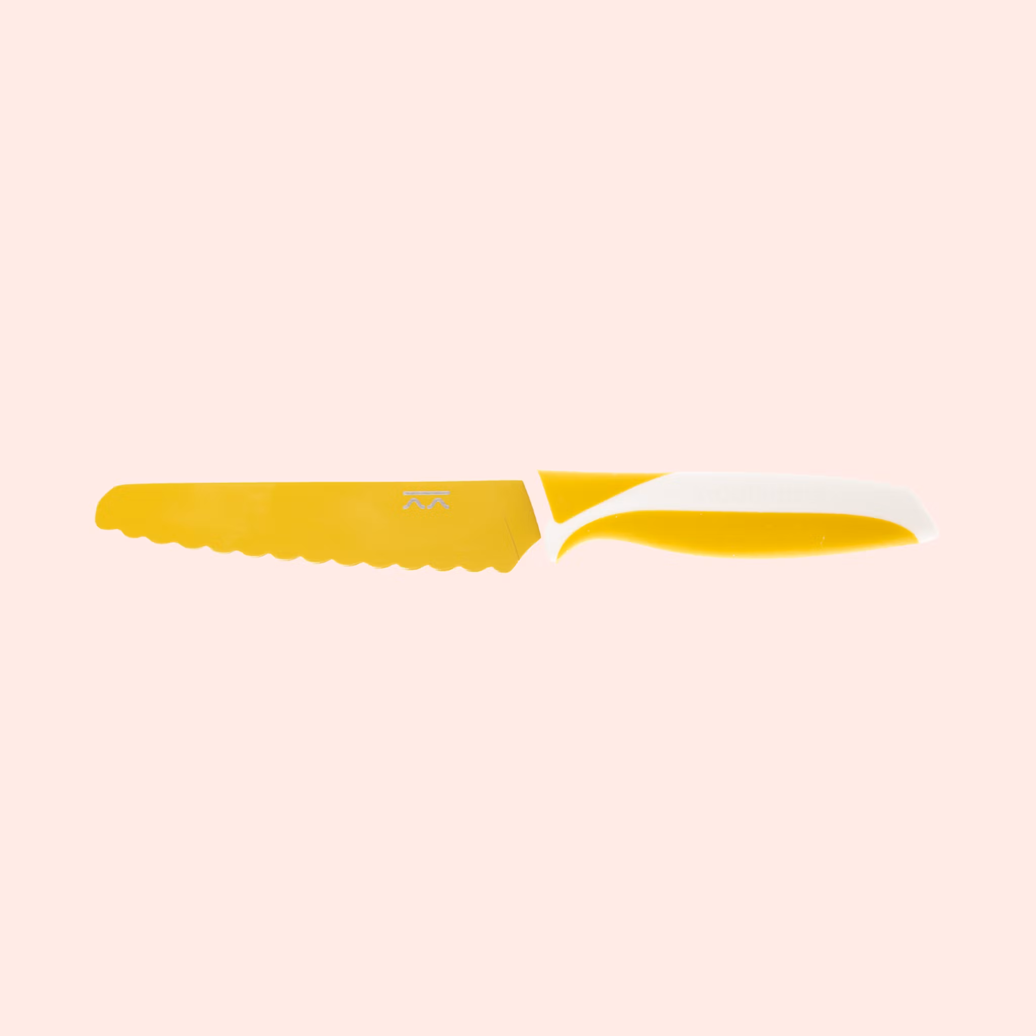 Barnsäker kniv med rostfritt stålblad och rundade tandningar. "Kiddikutter cuts food, not fingers".