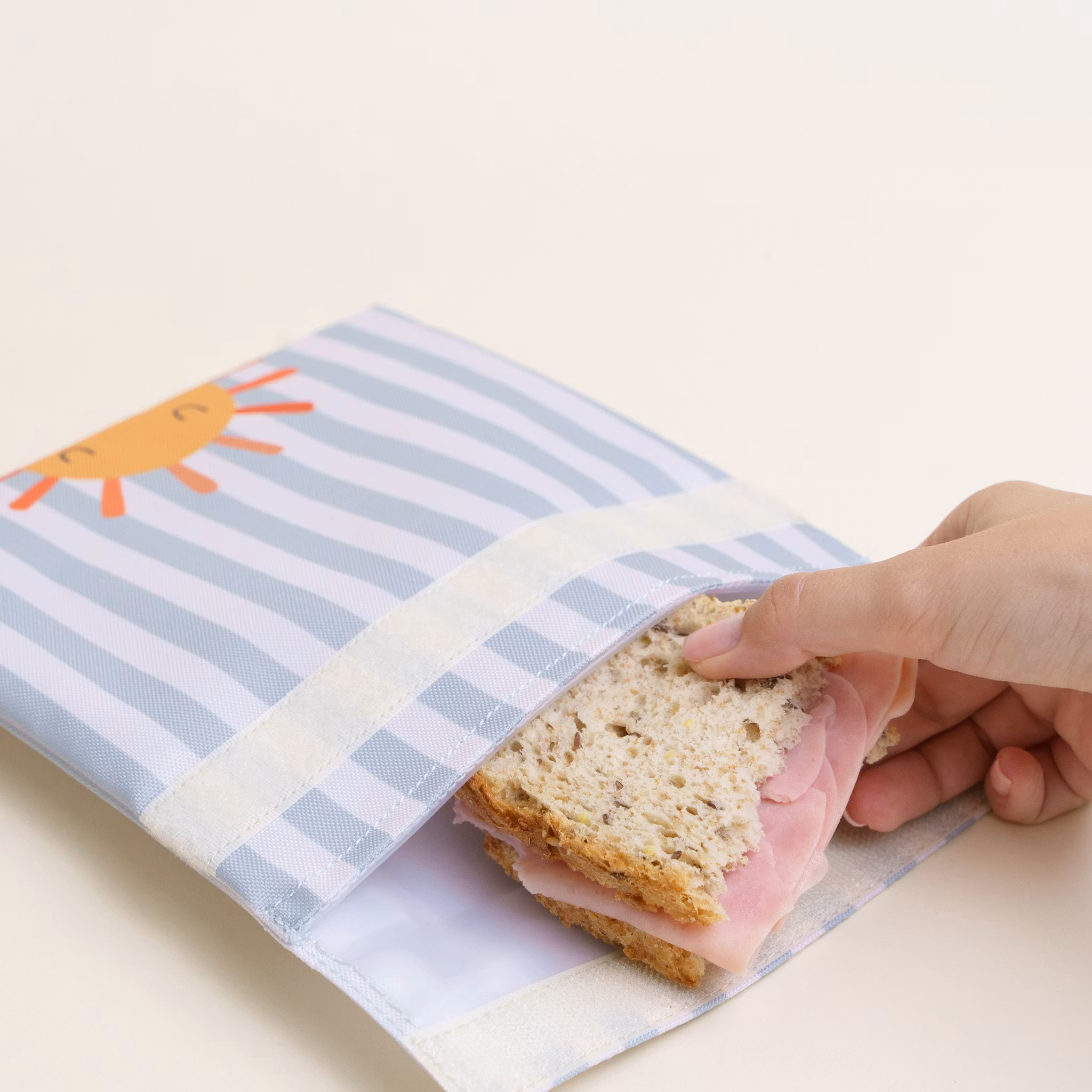 Snack bag / smörgåspåse tillverkad av RPET. RPET är ett hållbart och miljövänligt material som kommer från återvunna plastflaskor vilket gör produkten till ett återanvändbart alternativ till engångsplast, aluminiumfolie etc. för att minska avfallet och skydda vår miljö. Tack vare sin kompakta storlek är snack-påsen dessutom perfekt för att packa smörgåsar, wraps, frukt eller små snacks till barnens utflykter och mellisstunder. Ryms smidigt i en ryggsäck, skötväska eller kylväska.