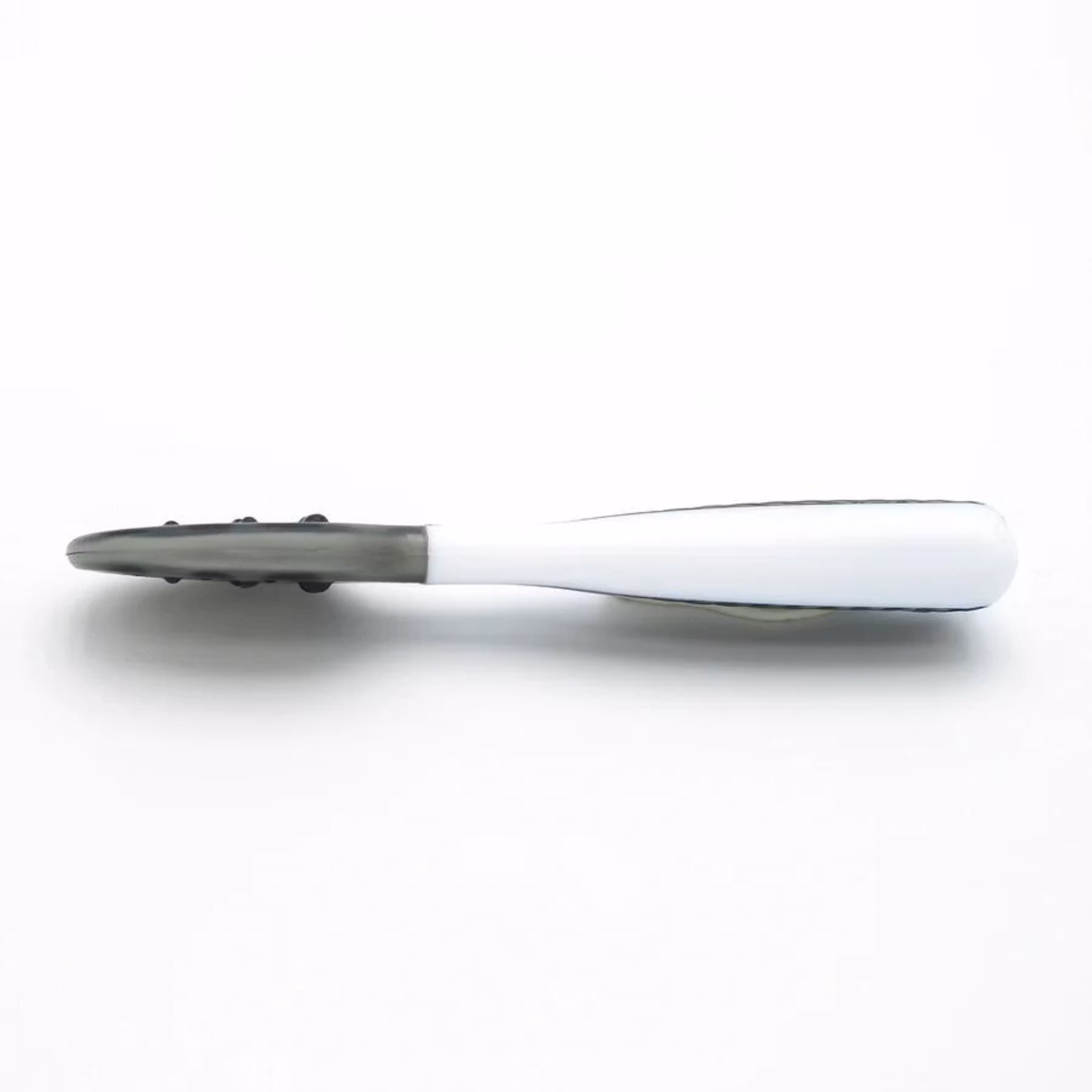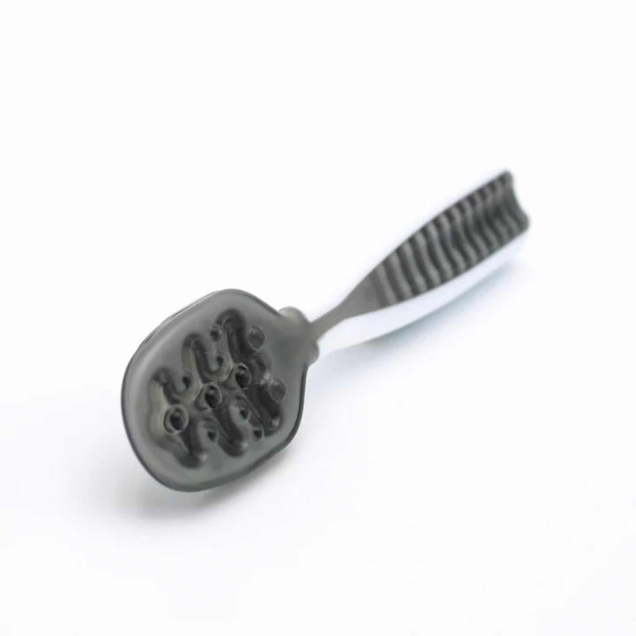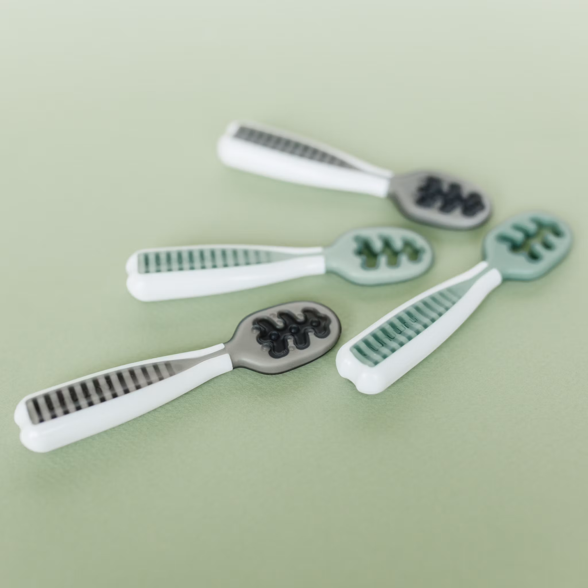 Skedarna främjar barns motoriska utveckling, då den innovativa designen med dess breda handtag, unika struktur och material i silikon gör att maten lätt fastnar på skeden. Det spelar ingen roll vilken sida bebisen äter ifrån då båda sidorna ger övning och stimulans.