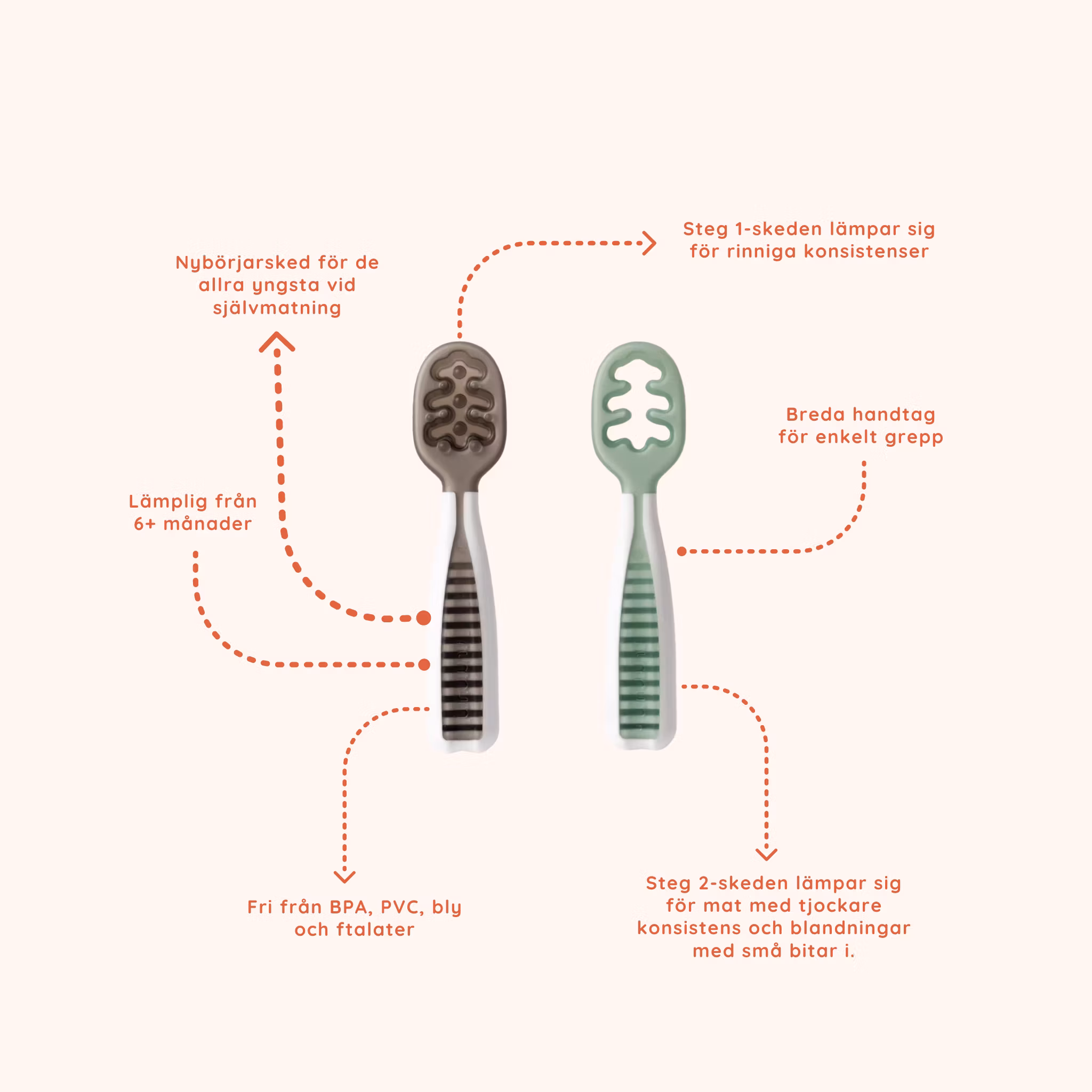 Till skillnad mot andra pre-spoons på marknaden innehåller detta set nybörjarskedar i två olika designer, utformade till att lämpa sig olika bra till olika livsmedels konsistenser. Steg 1-skeden lämpar sig extra bra vid introduktion av tunnare mat och steg 2-skeden sked är ypperlig när barnet bemästrat mat-till-mun-rörelsen och bemästrar tjockare konsistenser och blandningar med små bitar i.