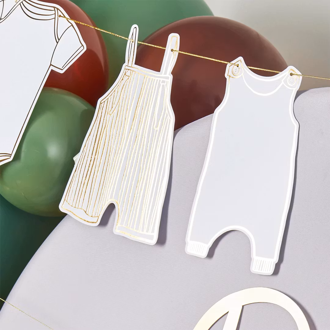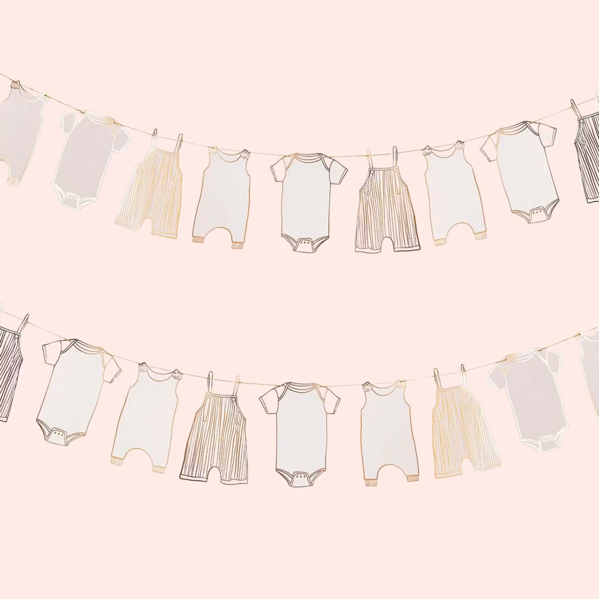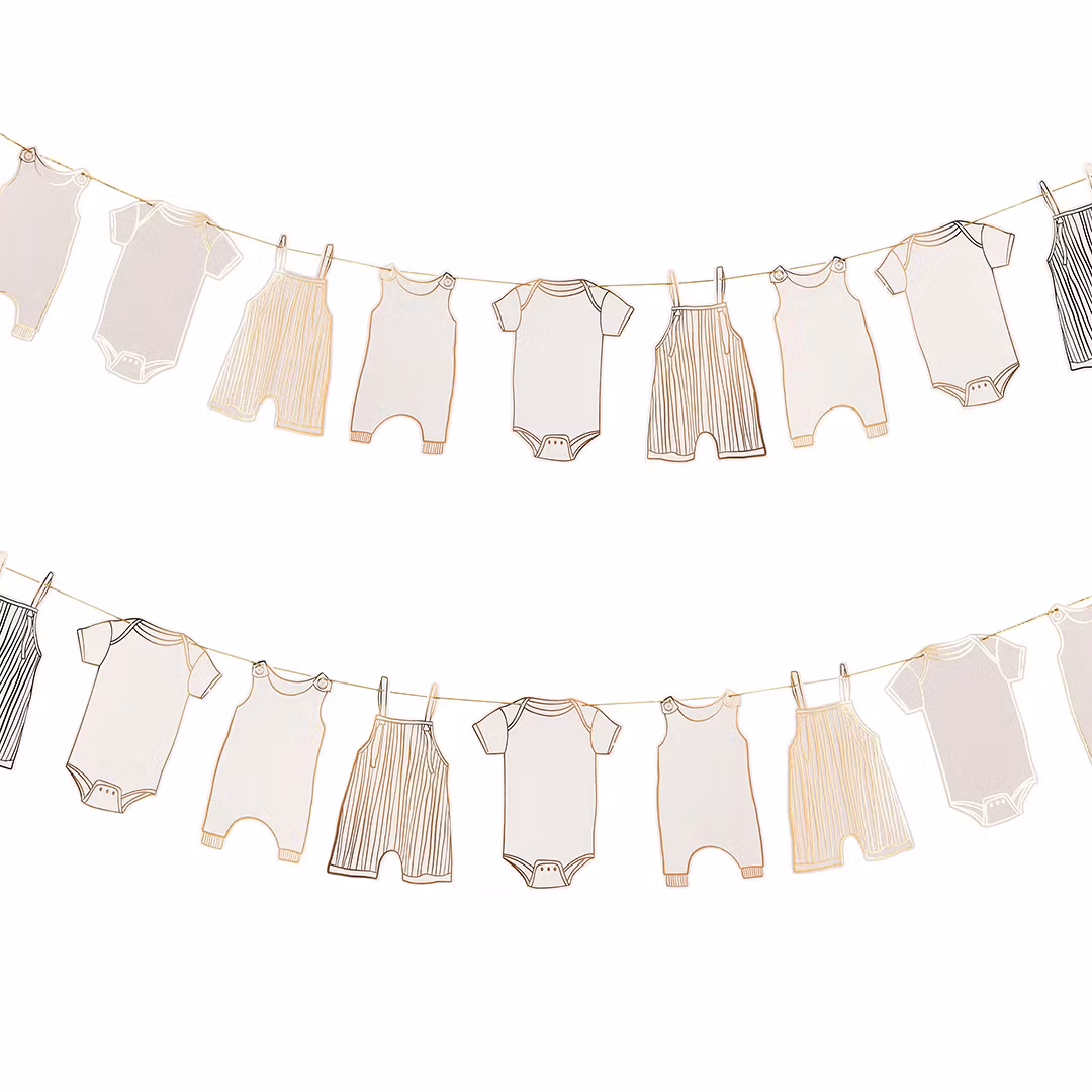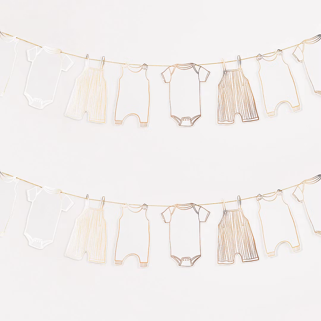 Girlang till baby shower. Material i papper med guldfolierade detaljer. Mäter 2.5 meter. Använd som den är eller som en del i aktivitet under baby showern då man kan även kan skriva på den eller använda till ex "Gissa-bebis-på-fotot-leken".