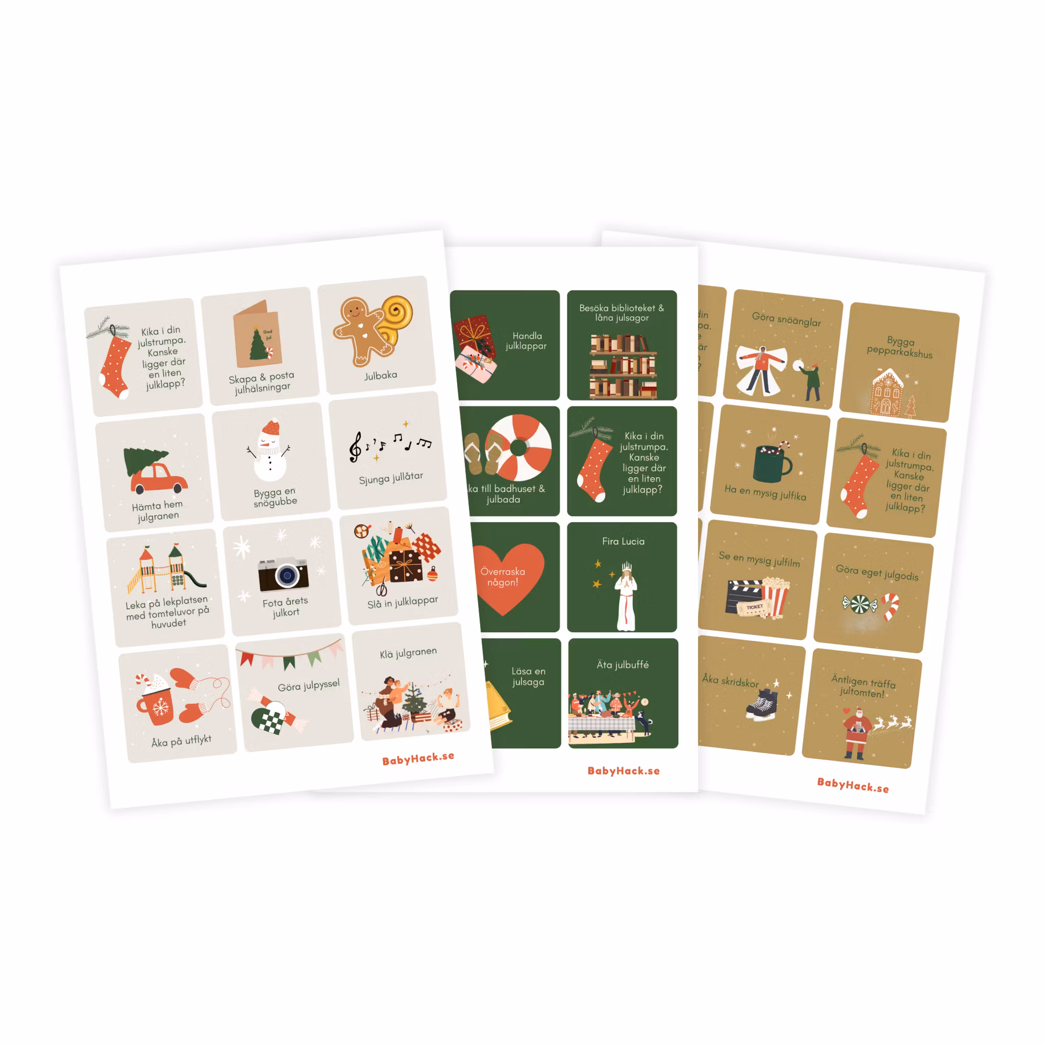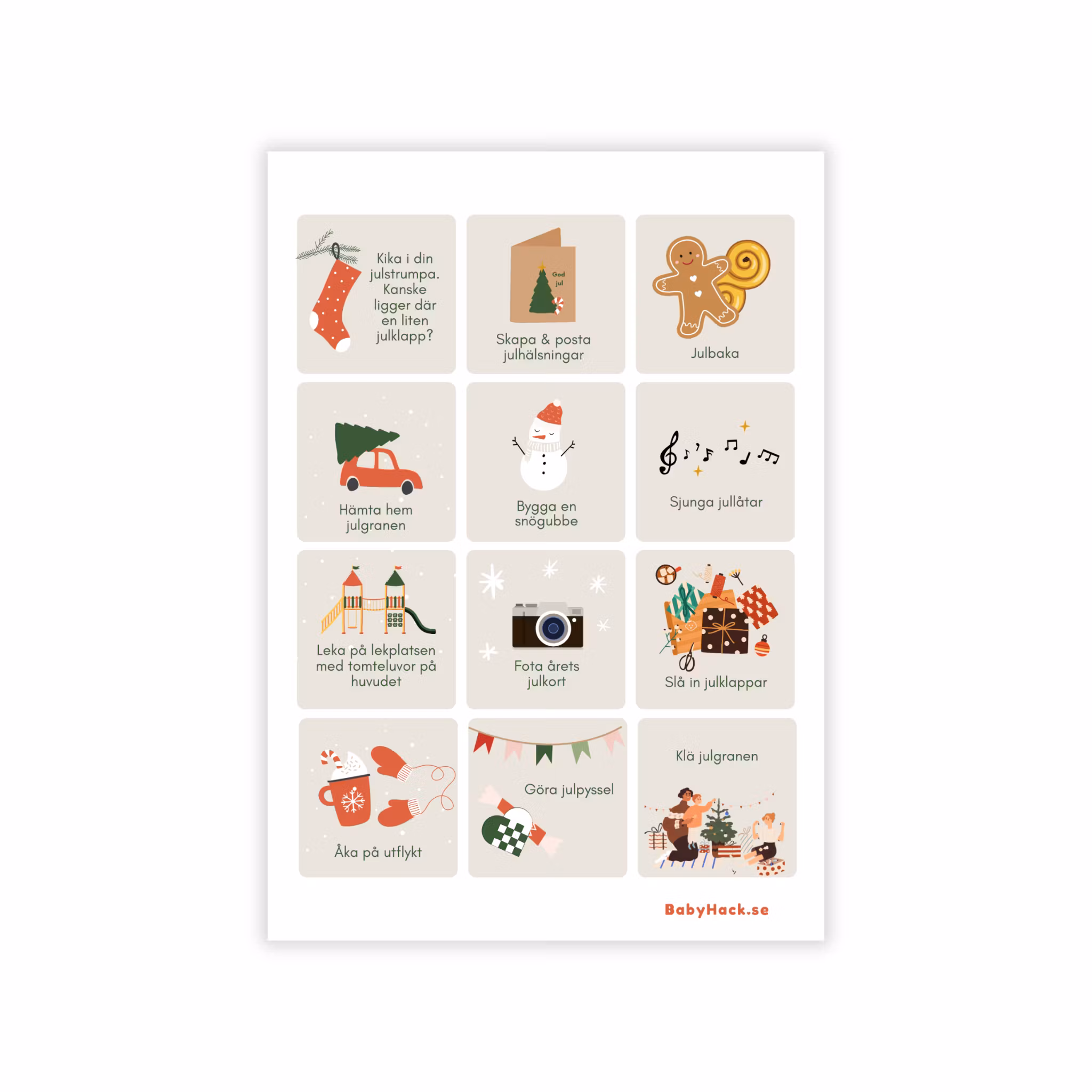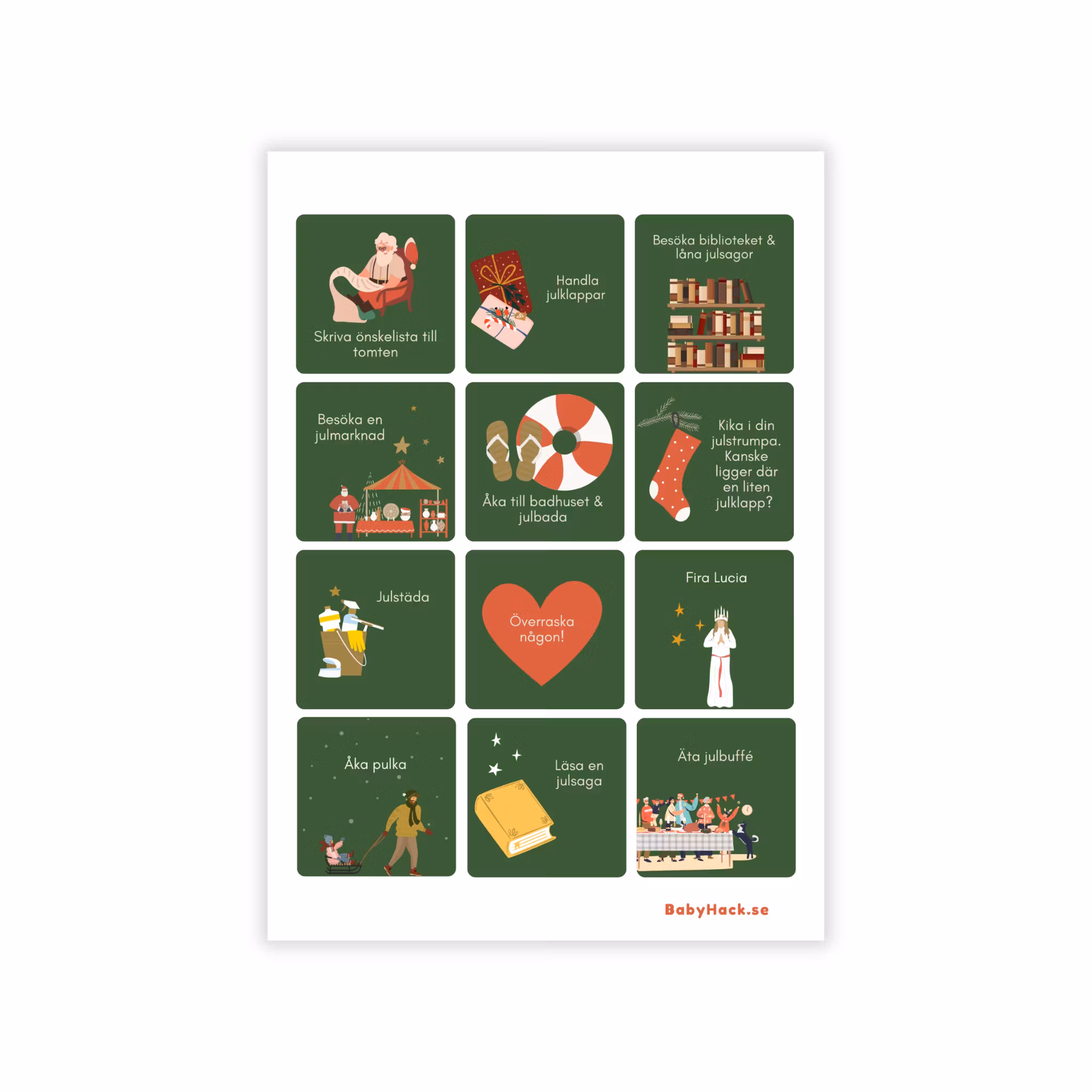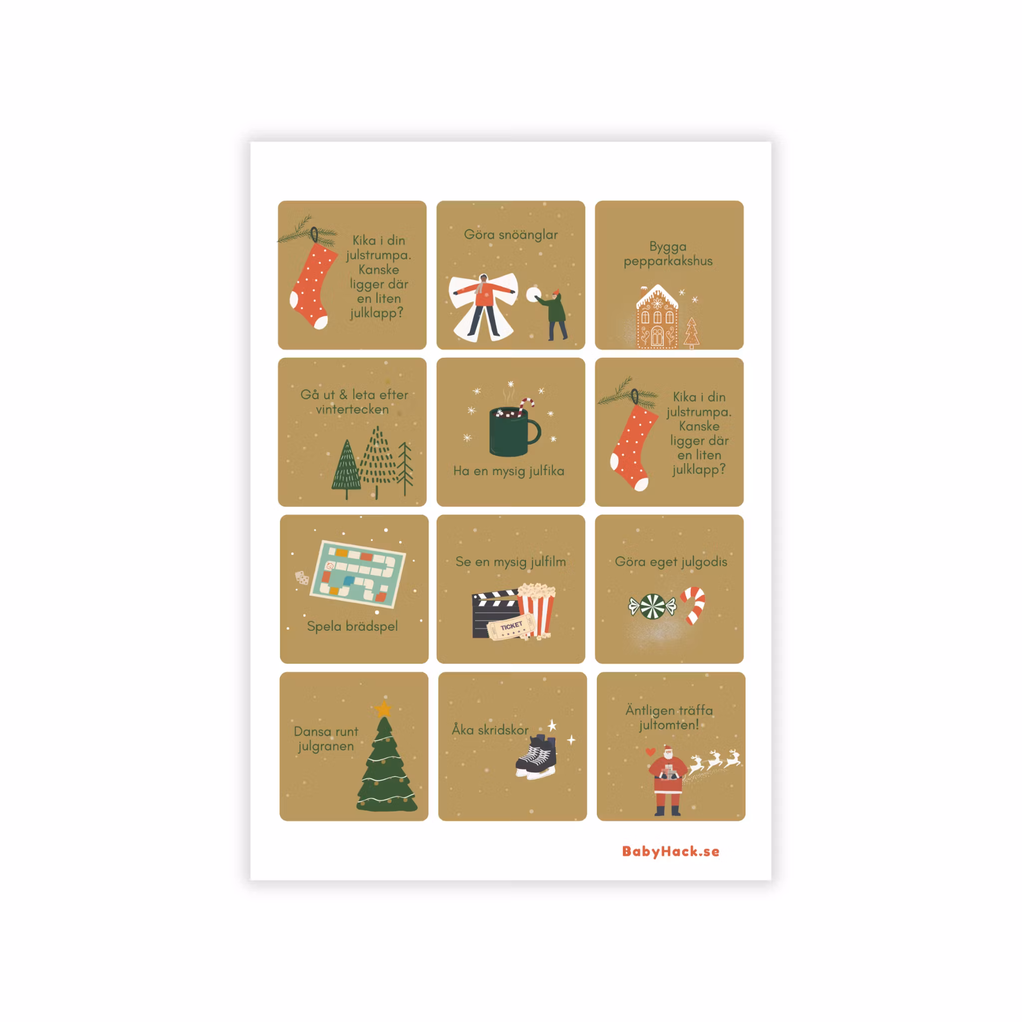 Kom i julstämning tillsammans med ditt barn varje dag ända fram till julafton med vår aktivitetskalender. Julaktiviteterna lämpar sig bra såväl i adventskalendern som till Nissebrev till Nissedörren men också som BINGO. Välj helt enkelt vad som passar er när ni väljer att använda mallen med juliga aktiviteter. Det finns 36 onumrerade aktiviteter för att ni ska kunna anpassa efter just ert livspussel. Alla aktiviteter behöver med andra ord inte hinnas med och det är givetvis okej att upprepa aktiviteter. Där finns också en sida med möjlighet att skriva in egna aktiviteter.