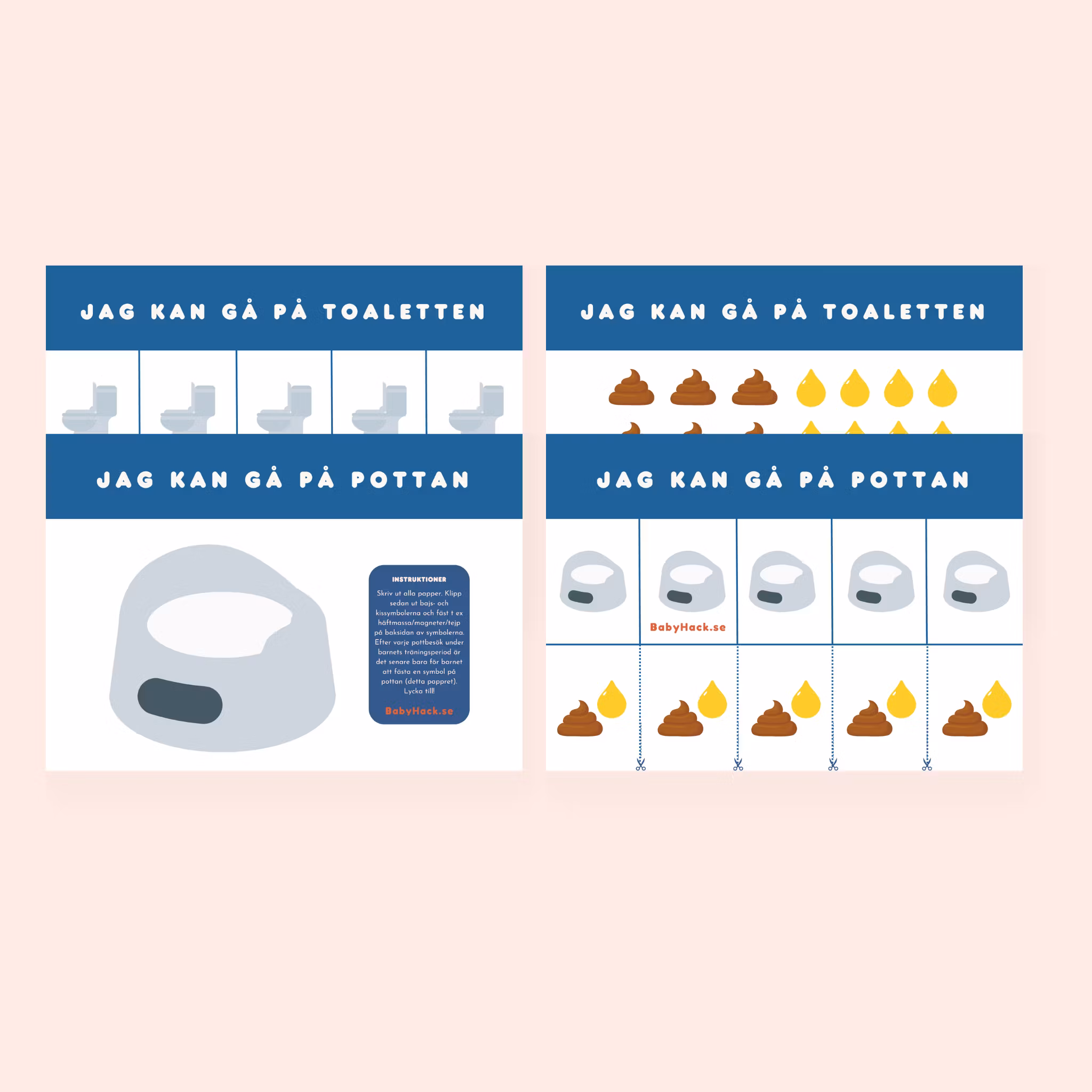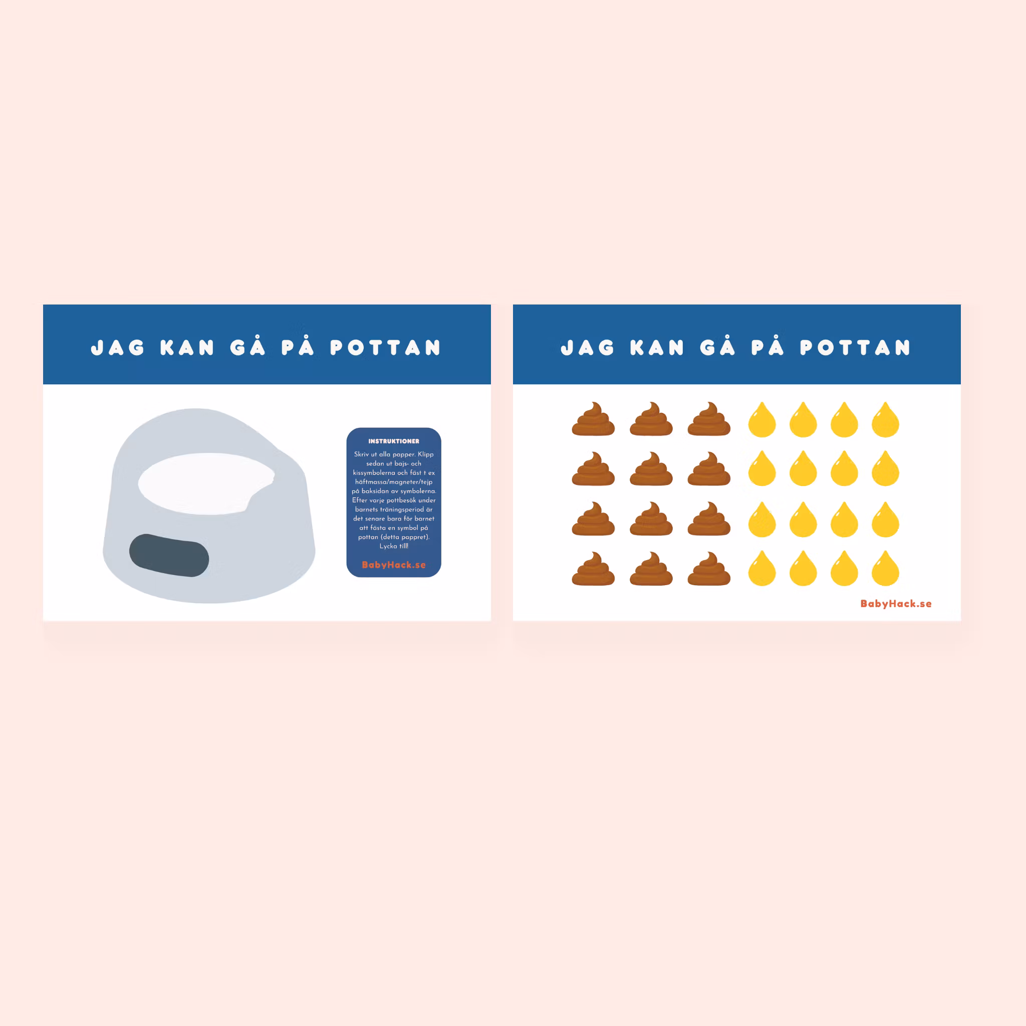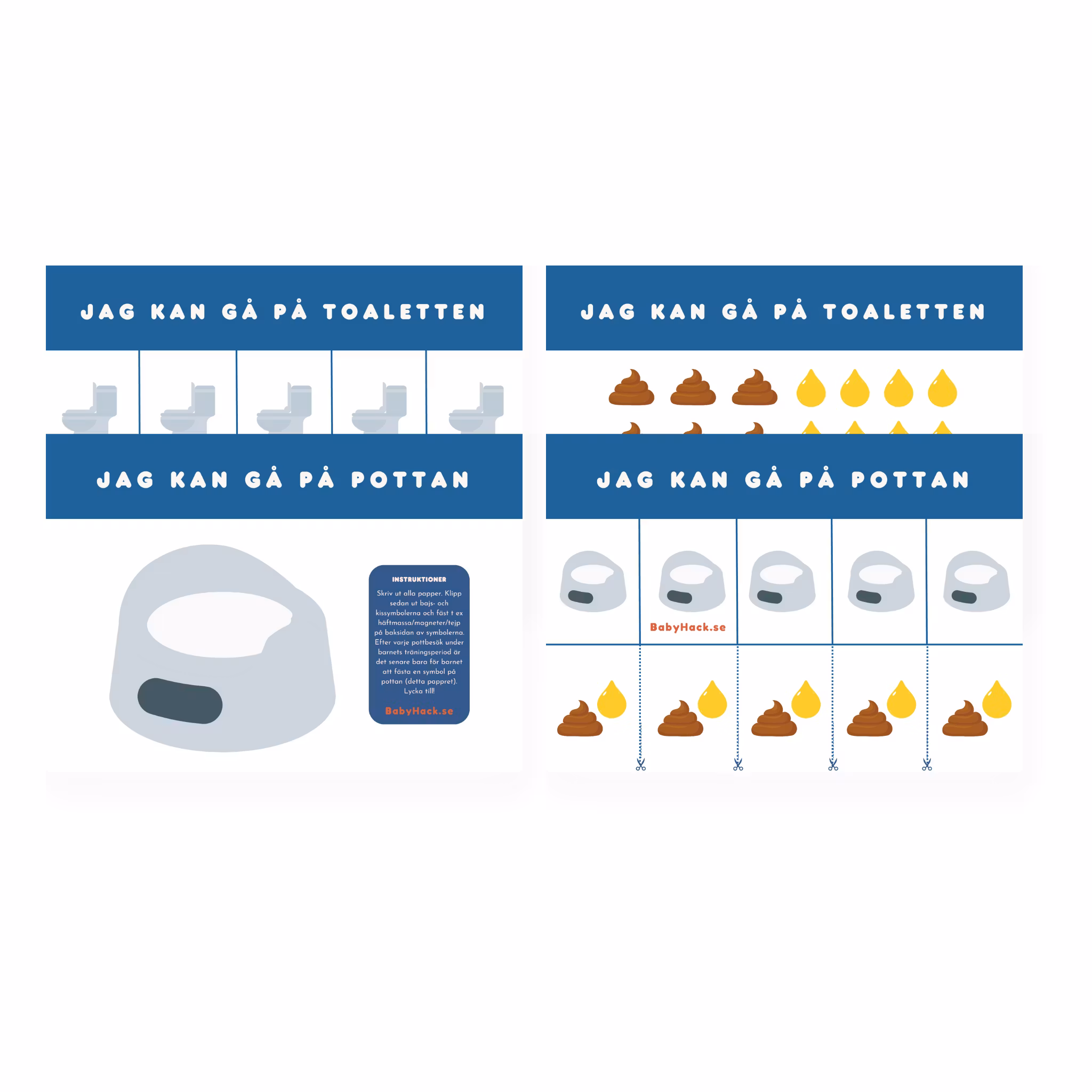 ✓ Tips 2: Skriv ut designen med potta/toalett samt arken med kiss- och bajssymbolerna. Klipp sedan ut bajs- och kissymbolerna och fäst t ex häftmassa/magneter/tejp på baksidan av symbolerna. Efter varje toalettbesök under barnets träningsperiod är det då bara för barnet att fästa en symbol på toalettstolen/pottan (på pappret). Både motiverande och roligt! Lycka till!