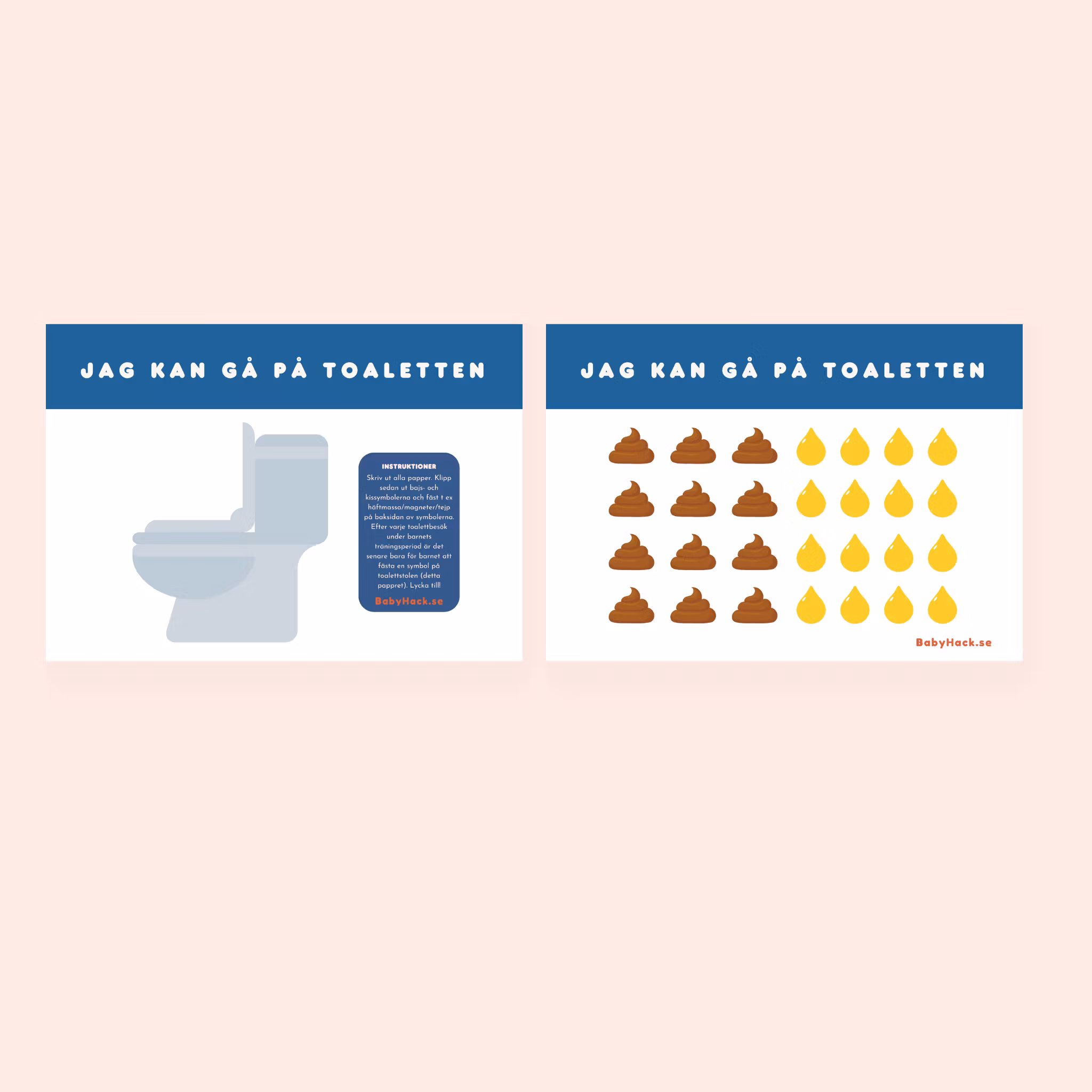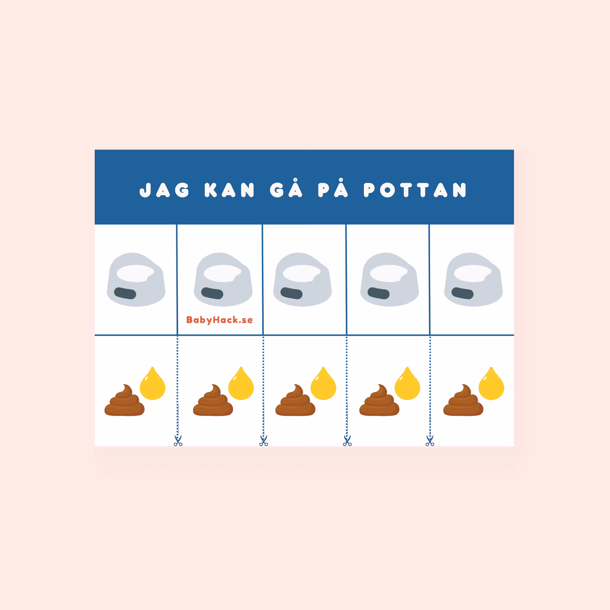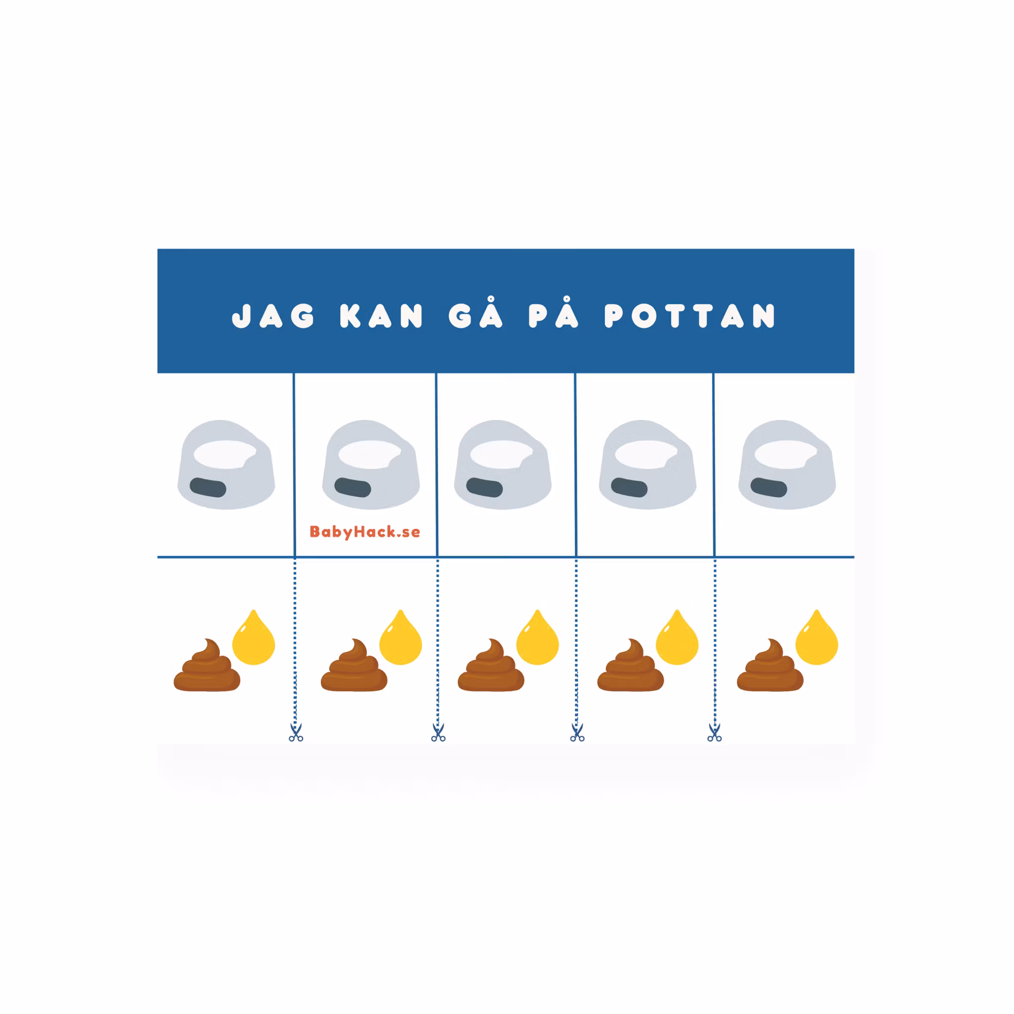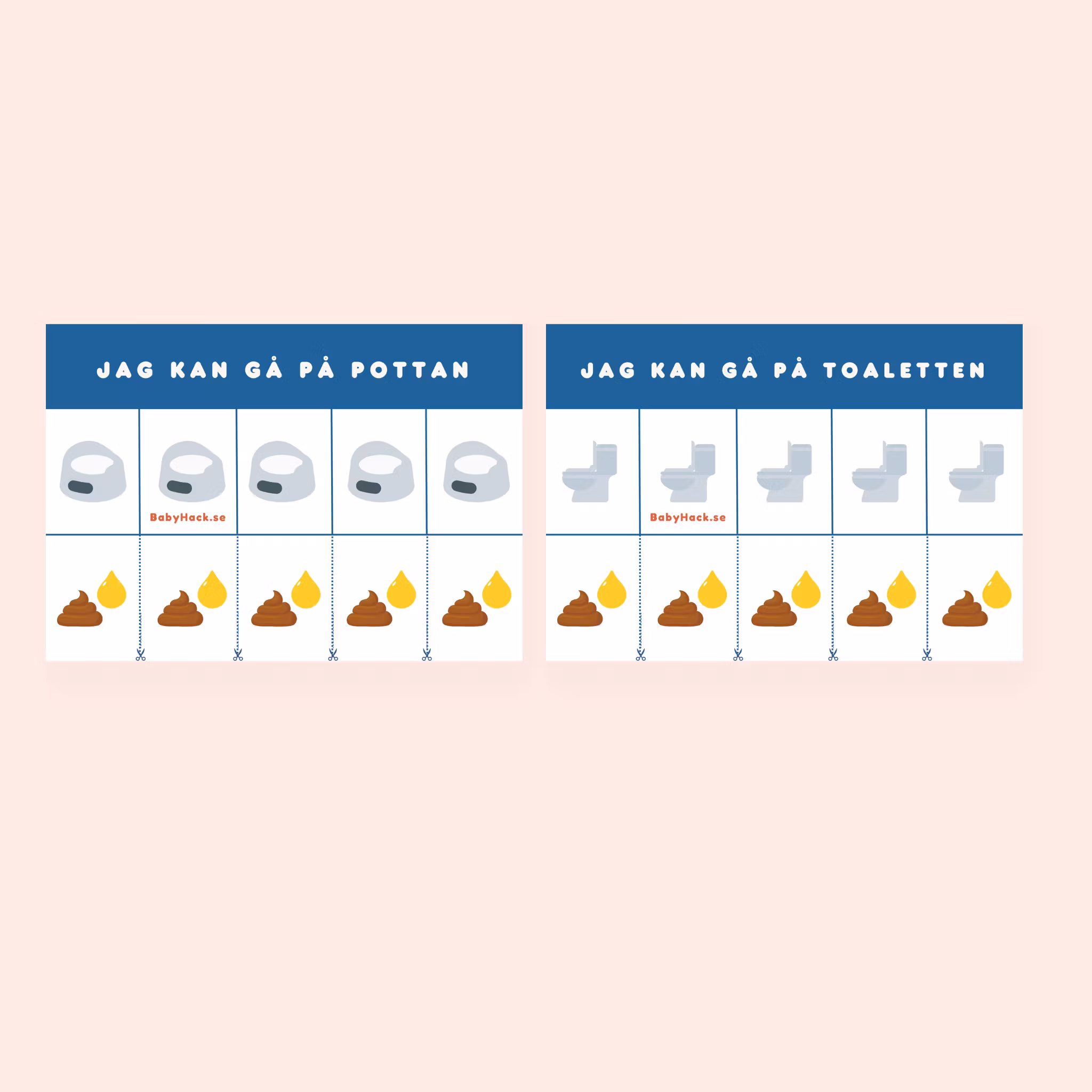 ✓ Tips 2: Skriv ut designen med potta/toalett samt arken med kiss- och bajssymbolerna. Klipp sedan ut bajs- och kissymbolerna och fäst t ex häftmassa/magneter/tejp på baksidan av symbolerna. Efter varje toalettbesök under barnets träningsperiod är det då bara för barnet att fästa en symbol på toalettstolen/pottan (på pappret). Både motiverande och roligt! Lycka till!