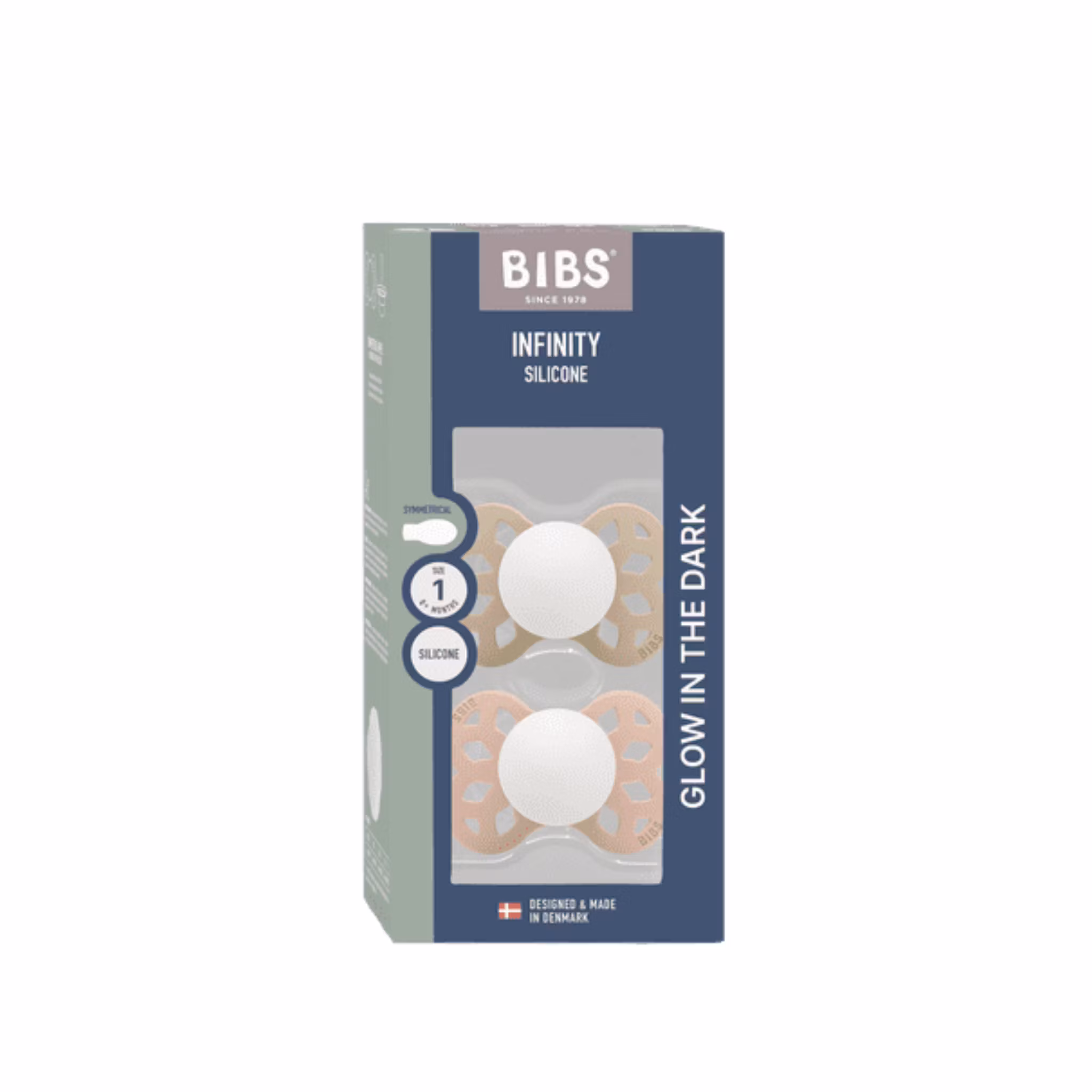 Exklusiva självlysande nappar från BIBS. Modellen Infinity har en symmetrisk sugdel gjord i mjuk och slitstark silikon. Säljs i 2-pack.