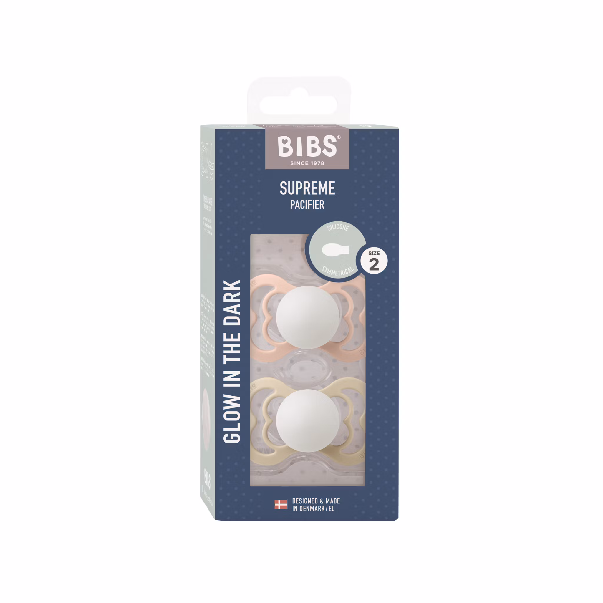 Exklusiva självlysande nappar från BIBS. Modellen Supreme har en symmetrisk sugdel gjord i mjuk och slitstark silikon. Säljs i 2-pack.