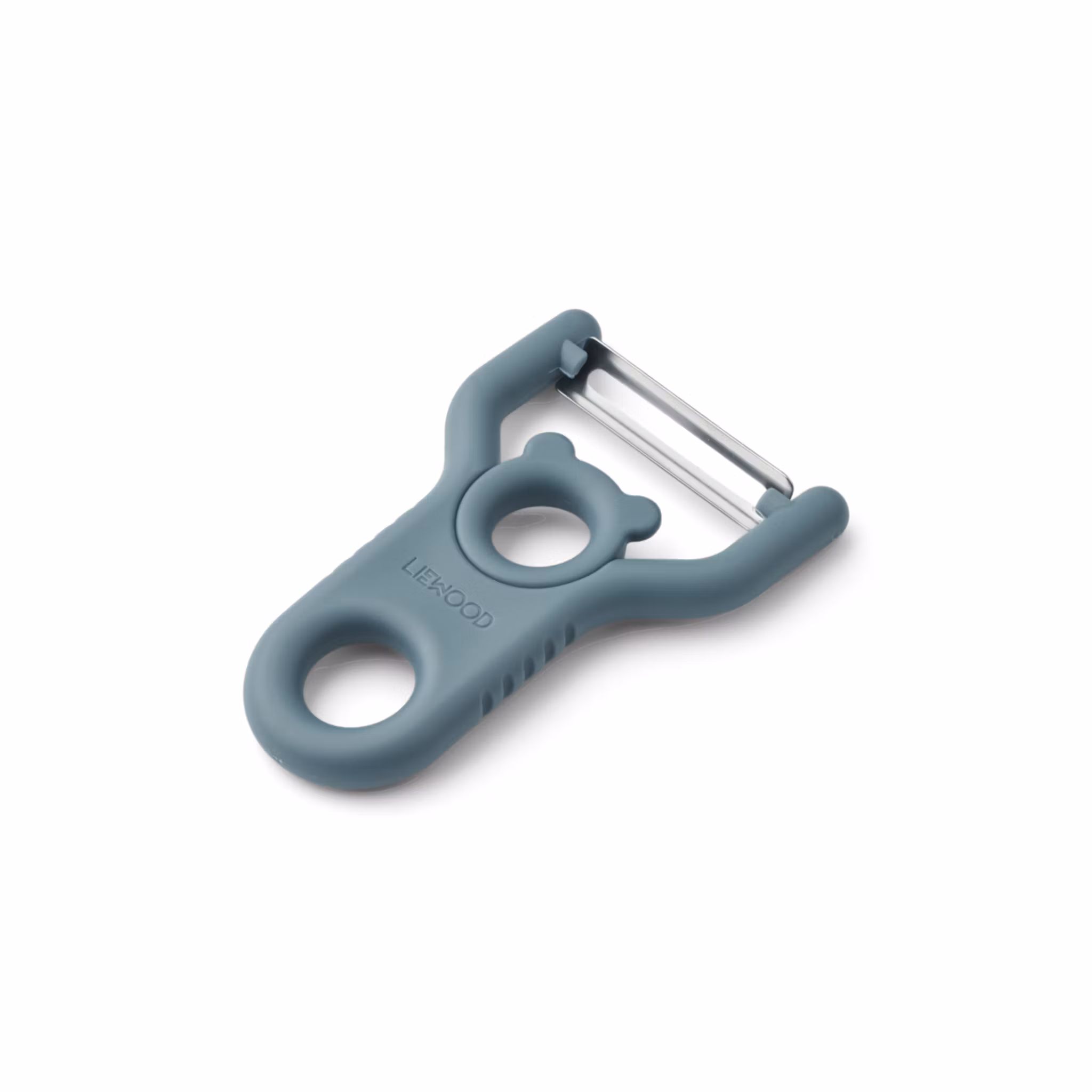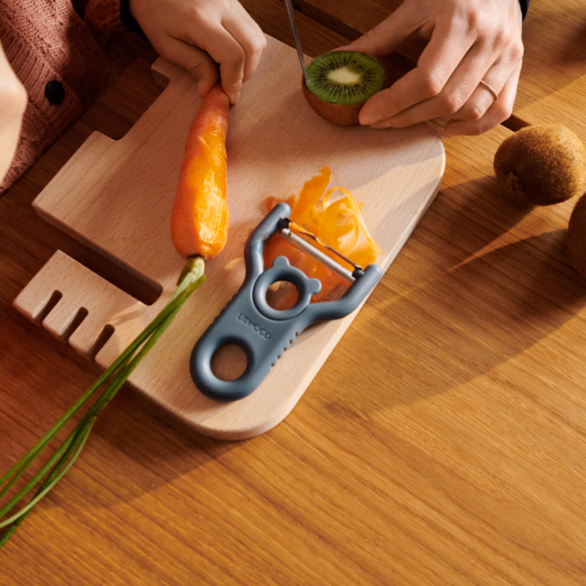 Skalare från Liewood designad till barn (5+ år). Liewood-skalaren är funktionell och har ett ergonomiskt handtag som gör den lätt för barnet att hålla i. Med den anpassade designen kan barnet bli en del av matlagningen och lära sig kökskunskaper på ett självständigt vis. Handtaget är specifikation av återvunnet ABS och bladen är i rostfritt stål. Skalaren tål maskindisk. Notera: skalaren är vass och inte en leksak.