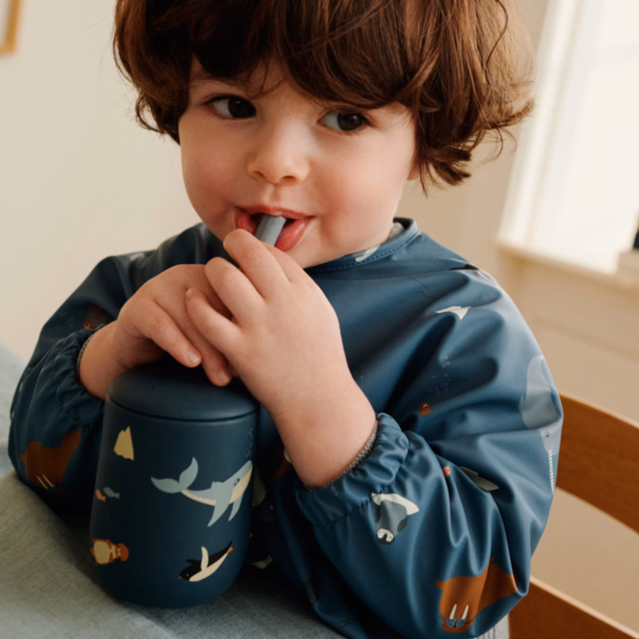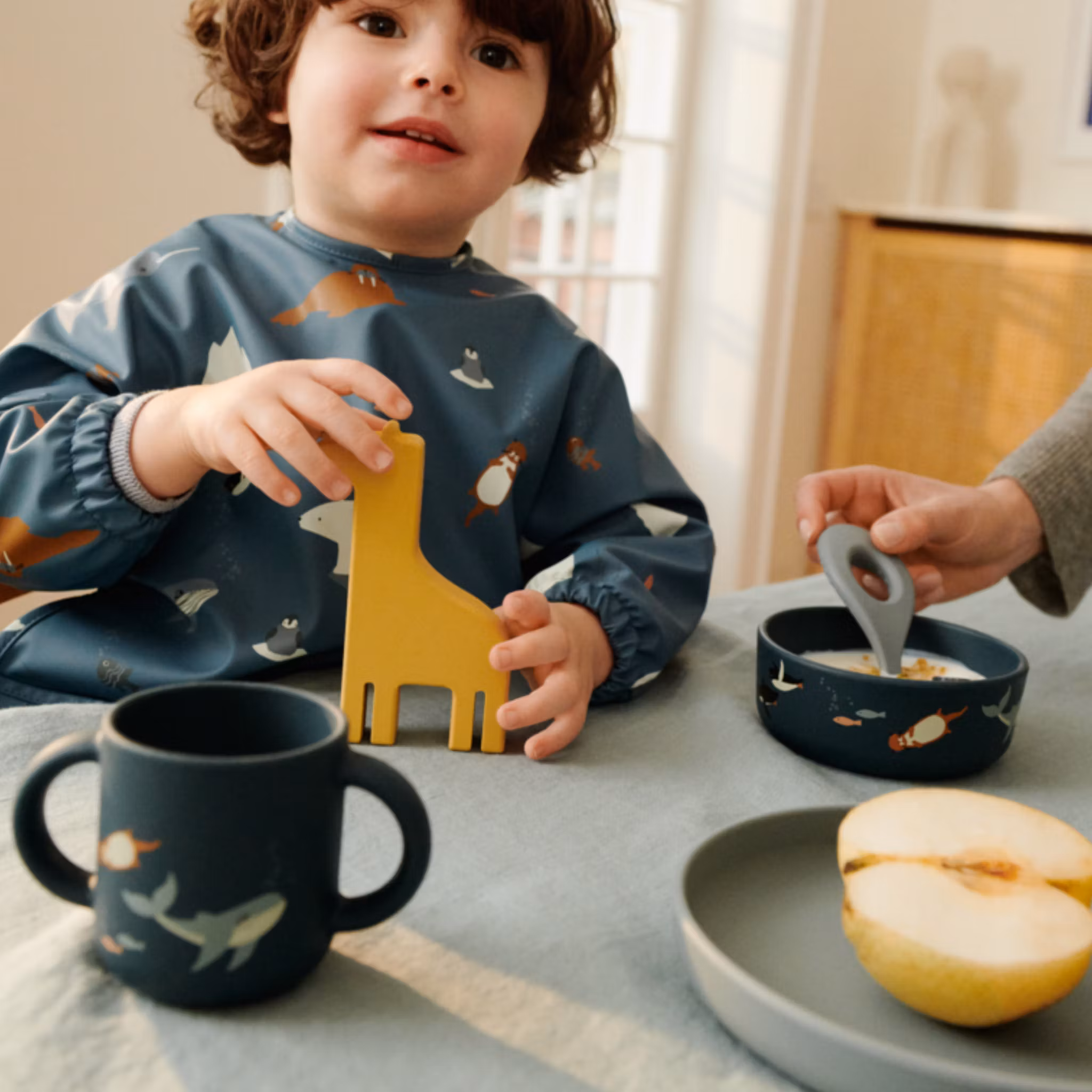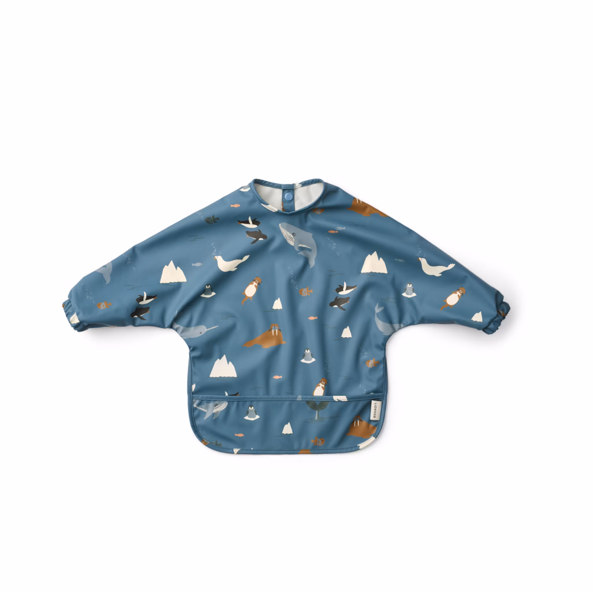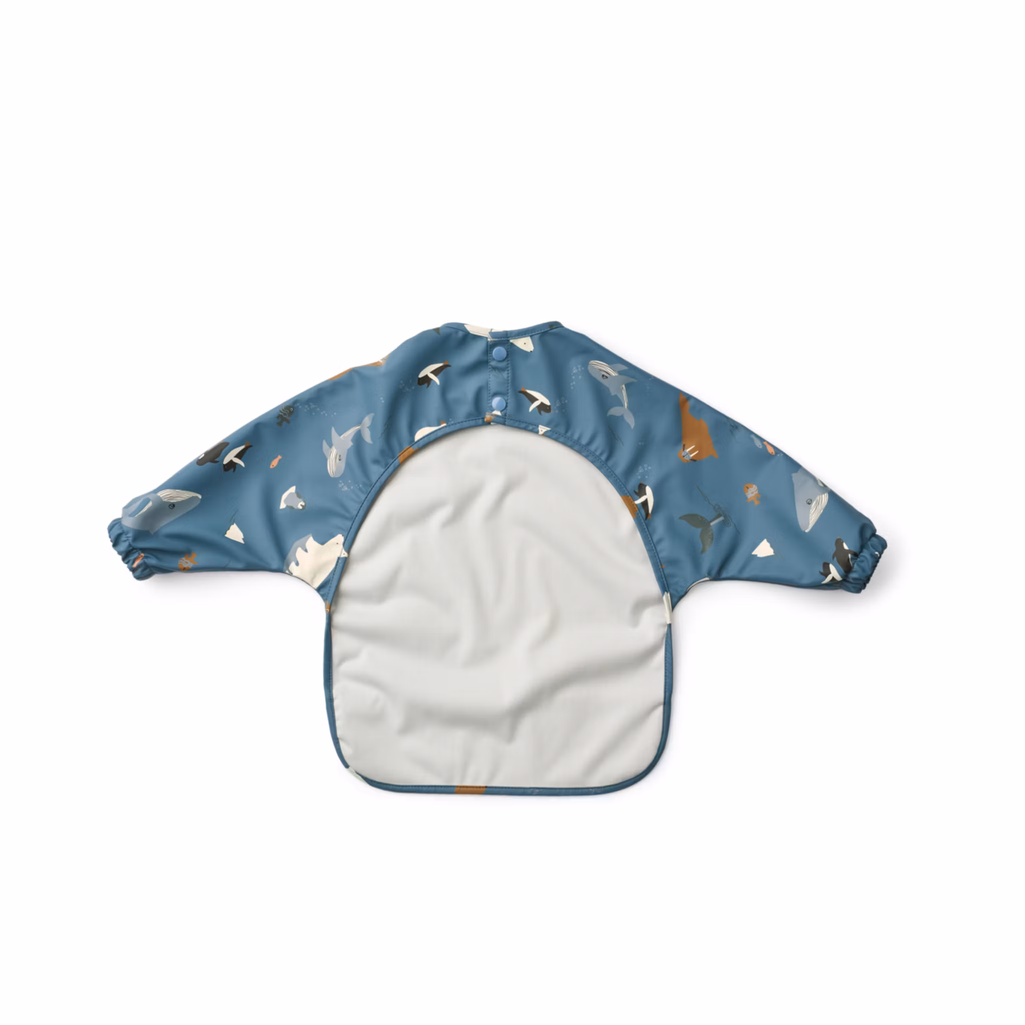 Haklapp med lång ärm från Liewood. Den perfekta haklappen som garanterat skyddar ditt barns kläder under måltiden. Haklappen är vattentät, har långa ärmar och en ficka i nederkant som fångar upp matrester innan de hamnar i knät eller på golvet. Ärmsluten har resår som garanterar att inget kladd letar sig in innanför haklappen.Haklappen är lätt och skön att bära, och rengörs enkelt genom att torka eller skölja av den. Du kan även tvätta den i maskin vid behov. Merle är en haklapp med ärm som finns i flera färgvarianter.