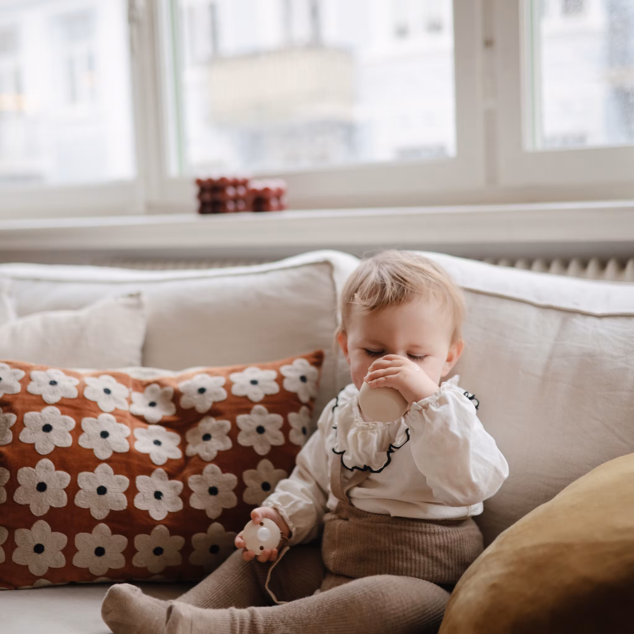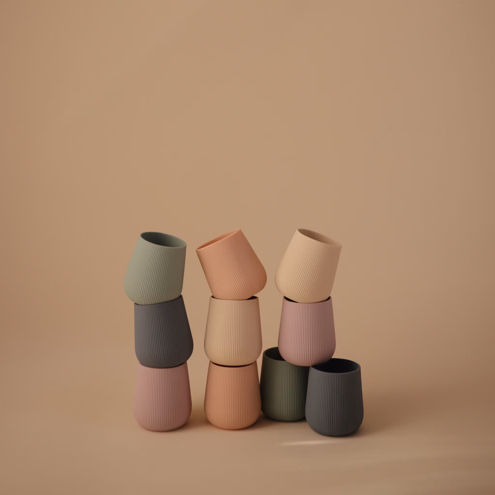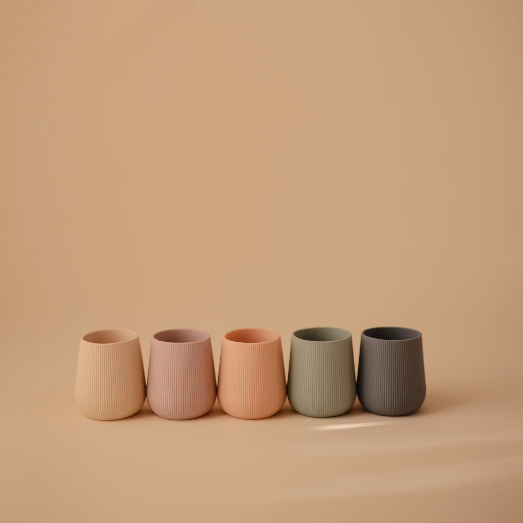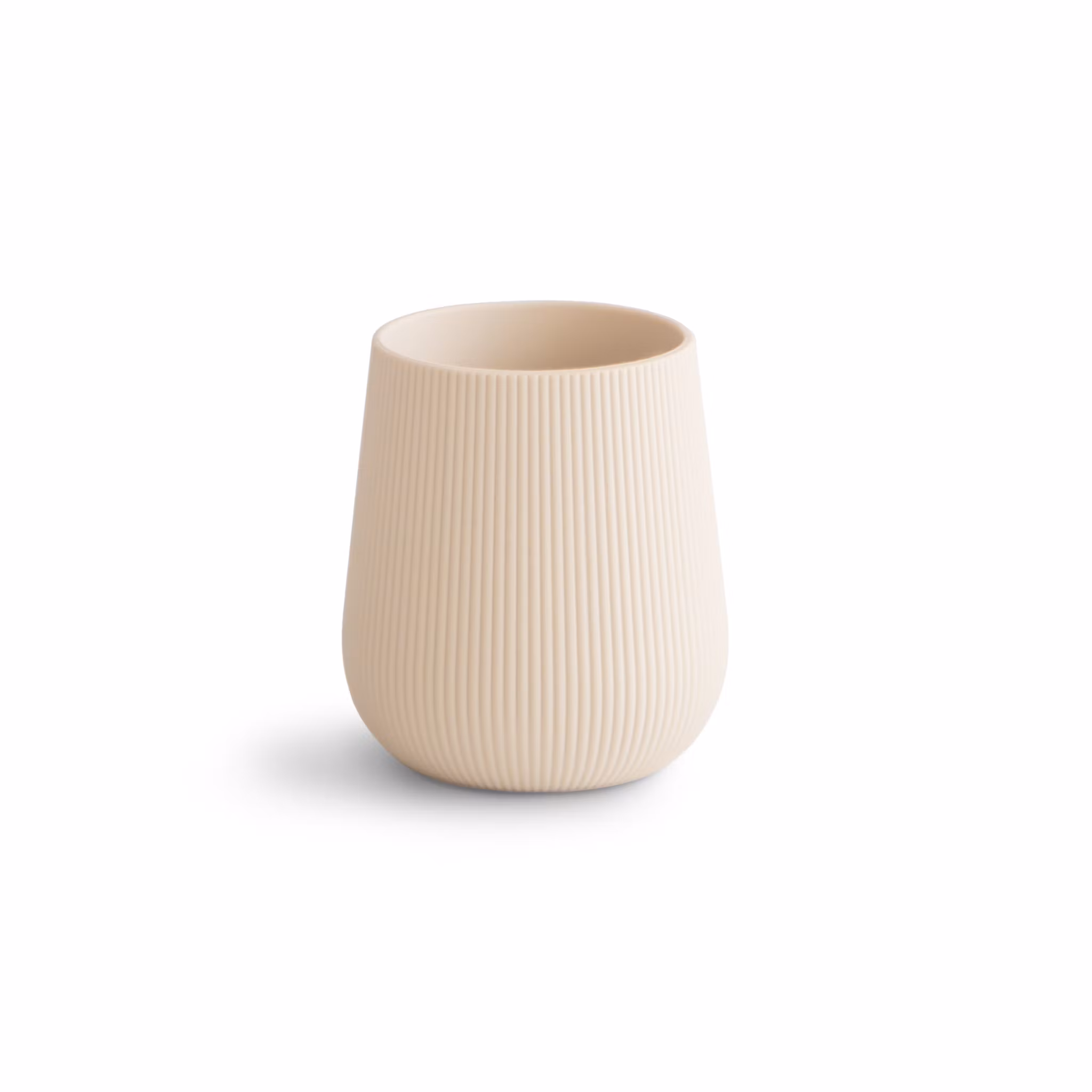 Gör övergången från flaska till kopp enklare med Mushies nybörjarmugg. Den yttre ribbade texturen ger ett halkfritt grepp samtidigt som den sensoriska texturen är skonsam när barn övar på att dricka ur en öppen kopp.