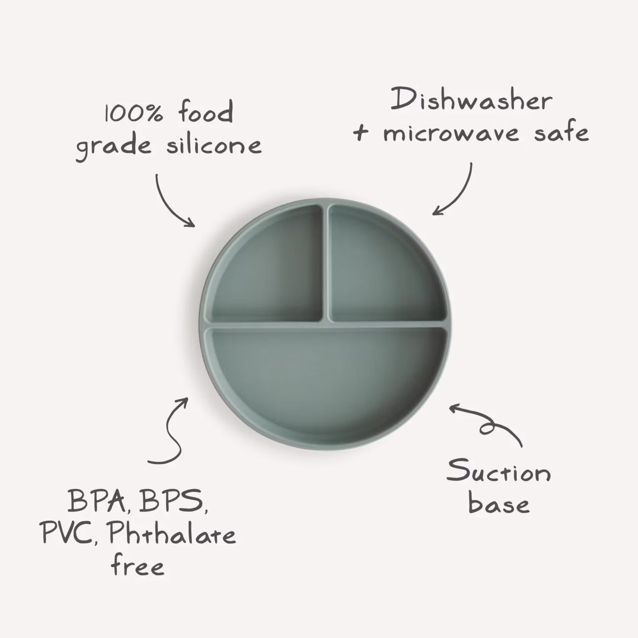 Populär sektionstallrik med sugfunktion från Mushie. En tallrik med sugplatta är perfekt för den lilla som håller på att lära sig äta mat själv då sugfunktionen ser till att plattan stannar på plats och minimerar spill och kladd runt bordet och på golvet. Obs! Se till att ytan under tallriken är slät och rengjord för bästa effekt!