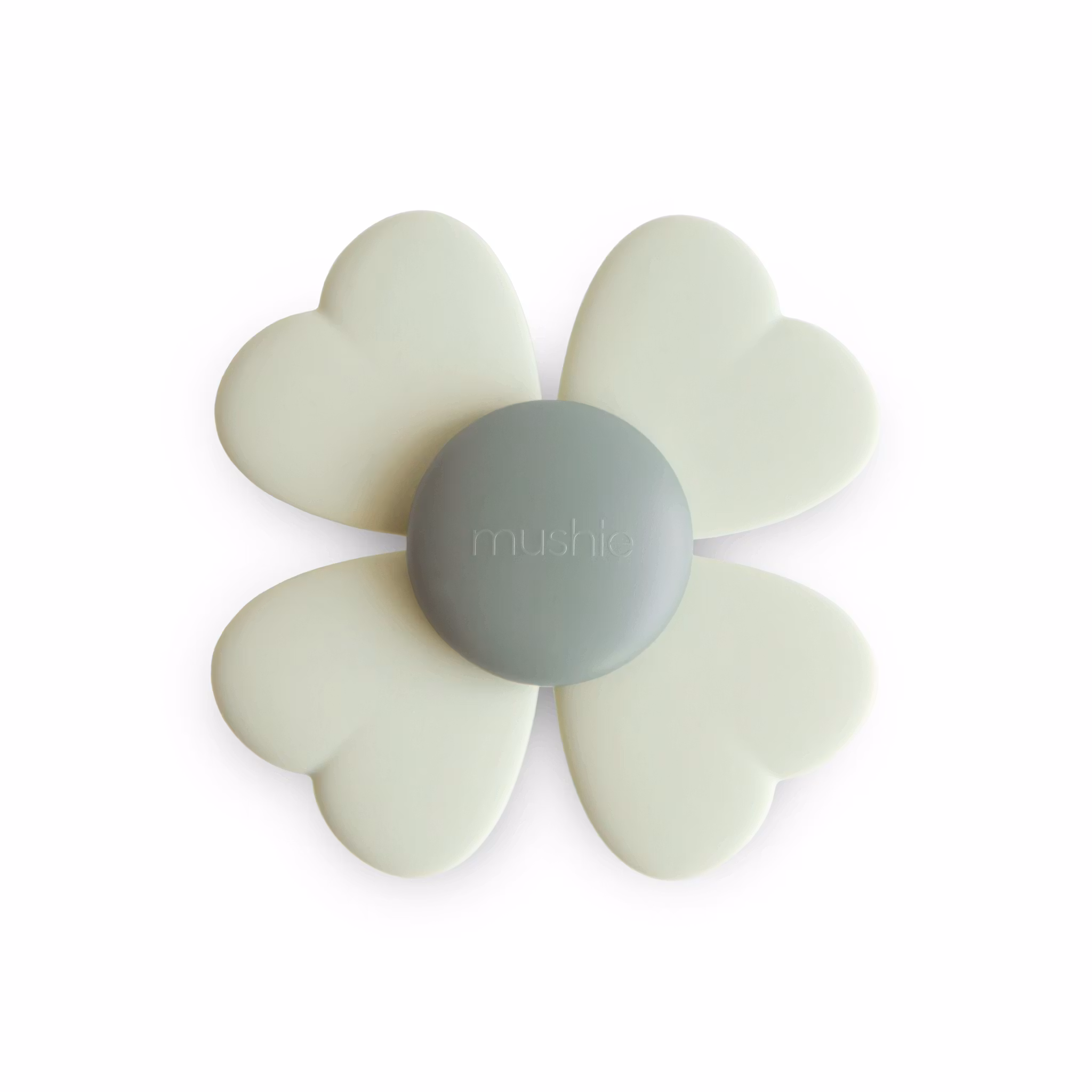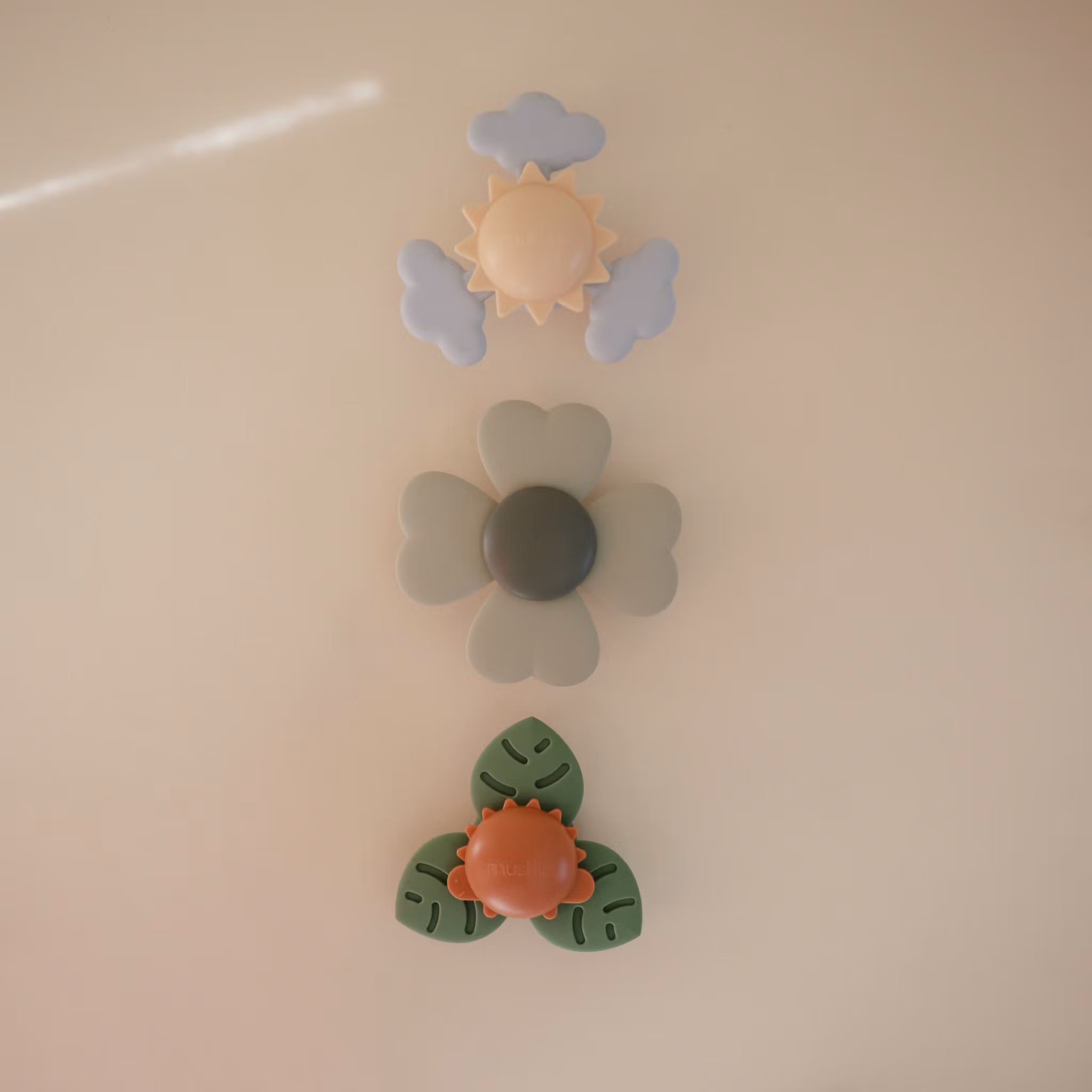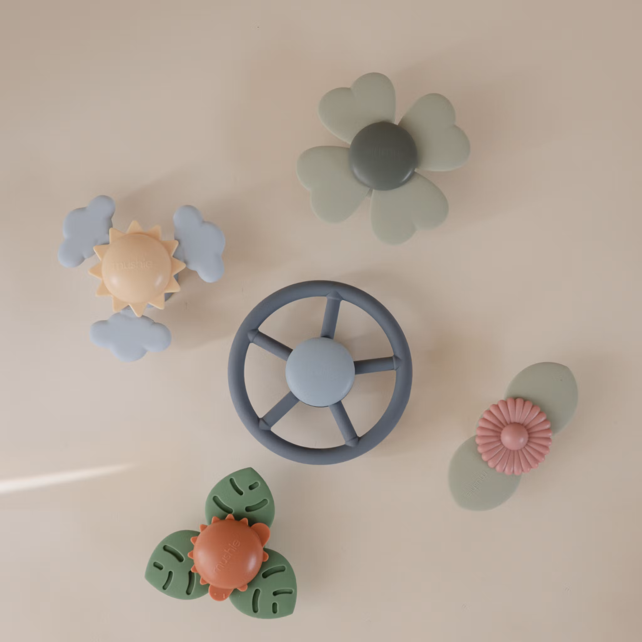 Med en lekfull design och lugnande färger fängslar Mushies snurrleksak lätt ditt barns fantasi. Den robusta sugproppen säkerställer att spinnern stannar på plats, förhindrar oavsiktliga fall och uppmuntrar till självständig lek.