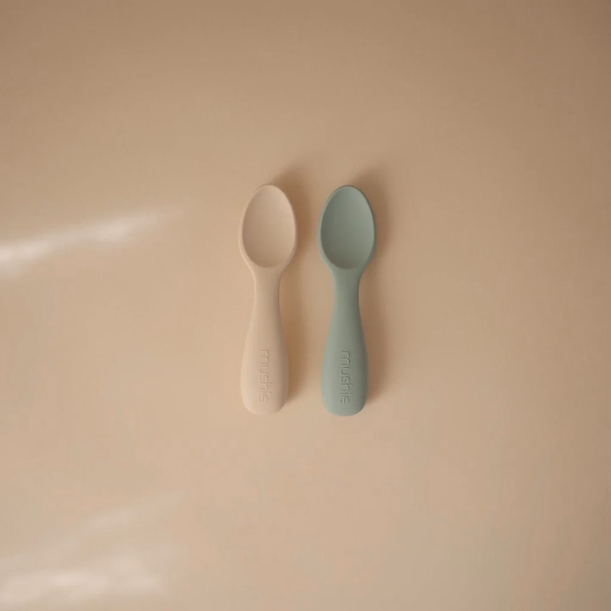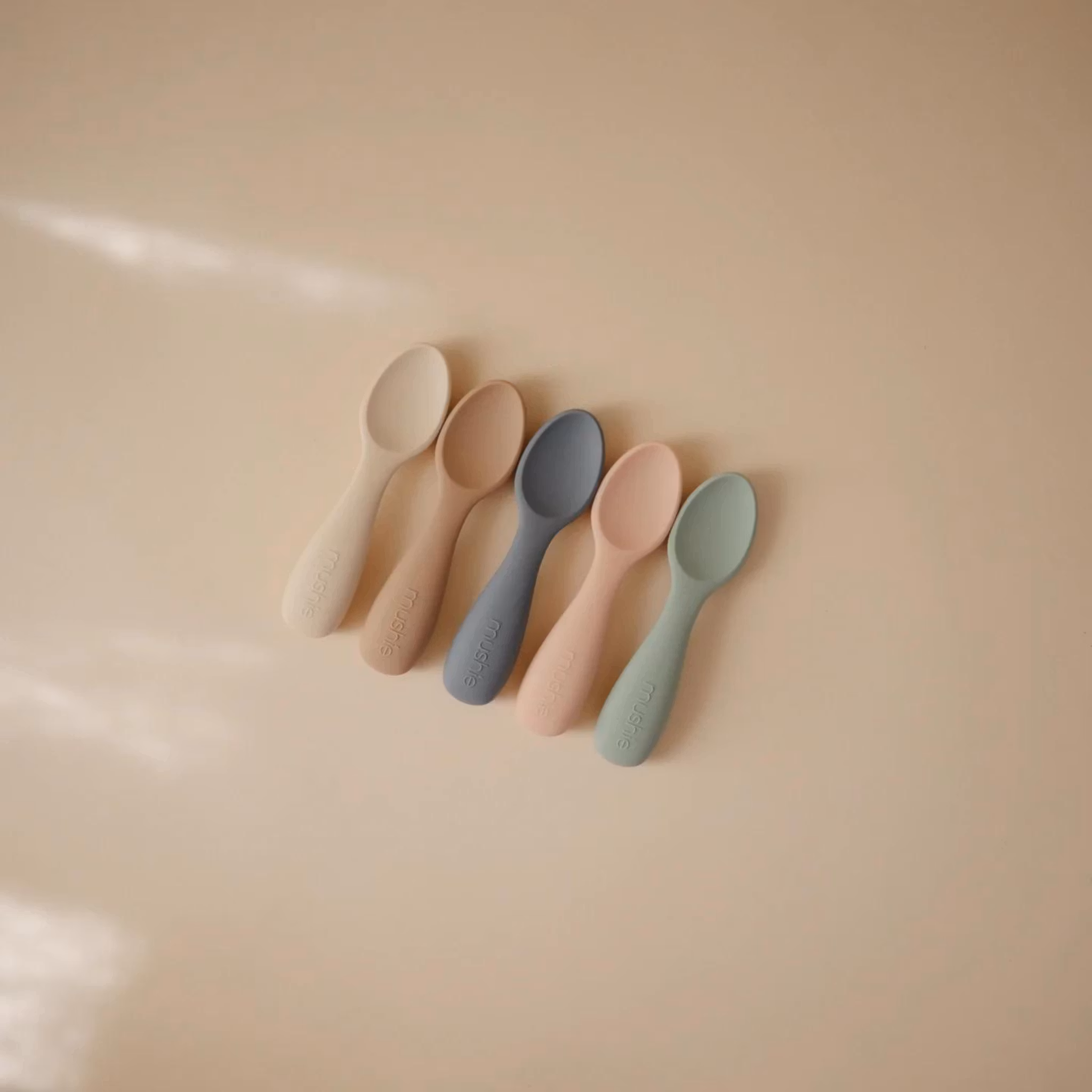 Nybörjarskedar i set från Mushie. Skedarna är i perfekt storlek för barn vid självständig matning då de har kortare skaft än många andra skedar på marknaden. Skedarna är gjorda av 100% giftfri, livsmedelsgodkänd mjuk silikon och är skonsam mot känsligt tandkött och framväxande tänder. Skedarna är designade för små händer och främjar koordinationen när barn lär sig att äta själv.