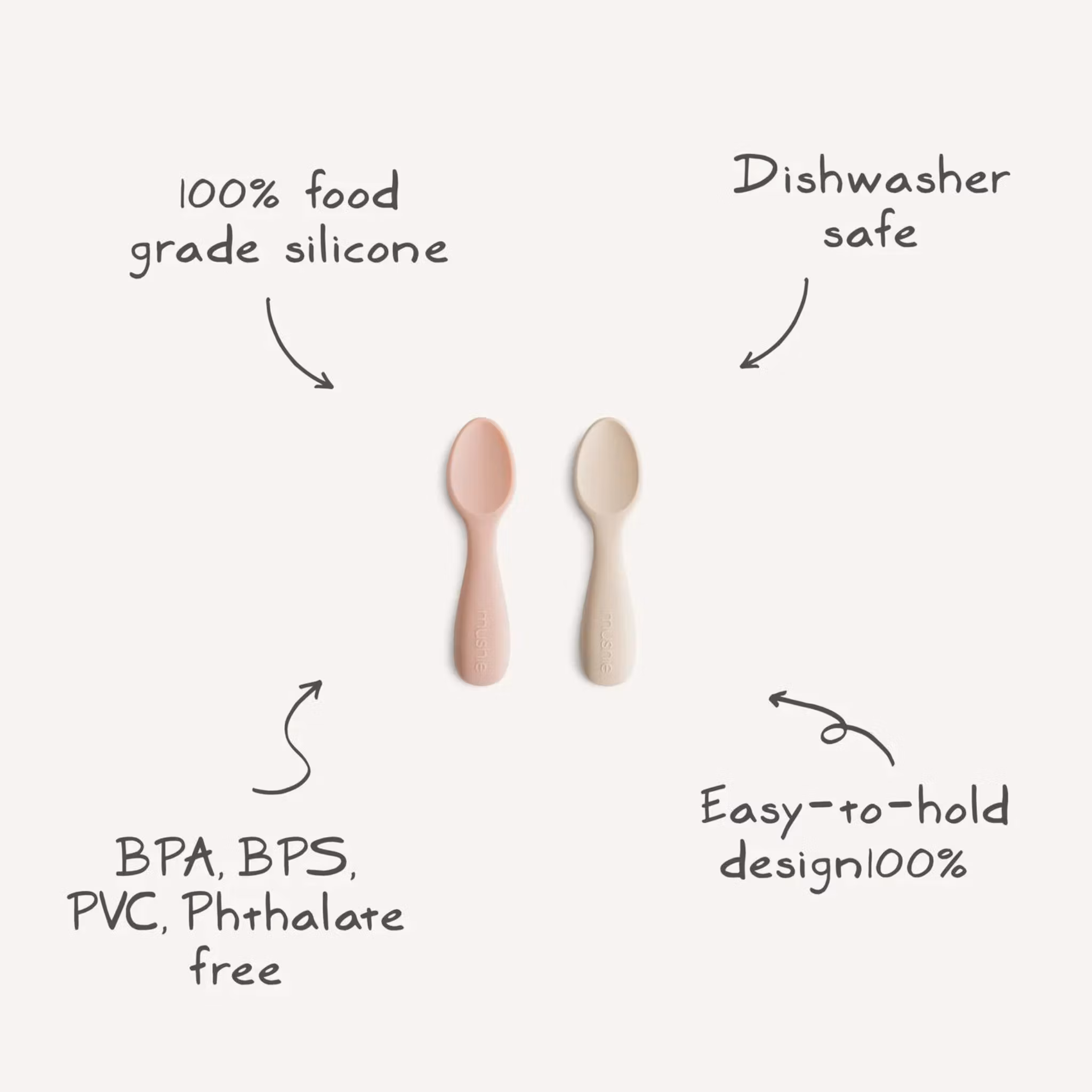 Nybörjarskedar i set från Mushie. Skedarna är i perfekt storlek för barn vid självständig matning då de har kortare skaft än många andra skedar på marknaden. Skedarna är gjorda av 100% giftfri, livsmedelsgodkänd mjuk silikon och är skonsam mot känsligt tandkött och framväxande tänder. Skedarna är designade för små händer och främjar koordinationen när barn lär sig att äta själv.