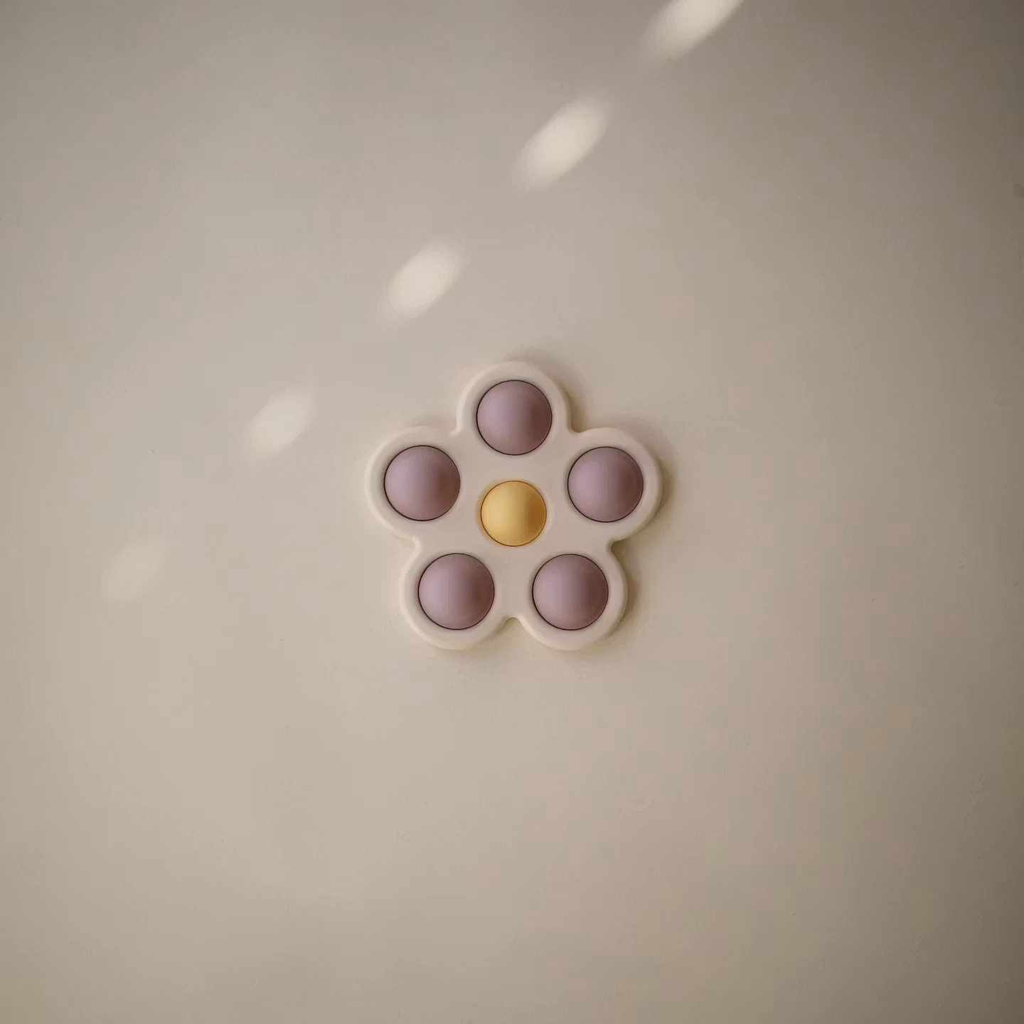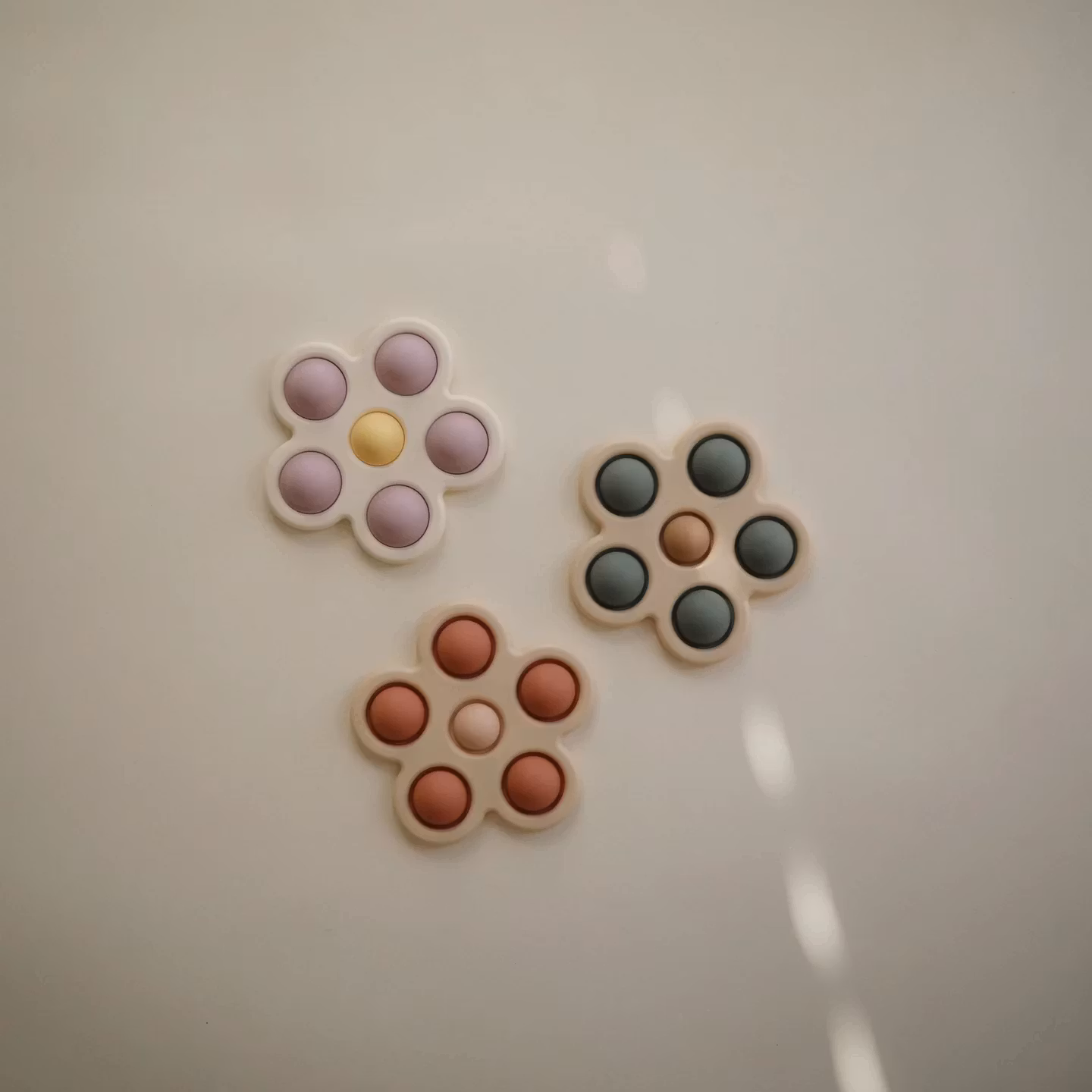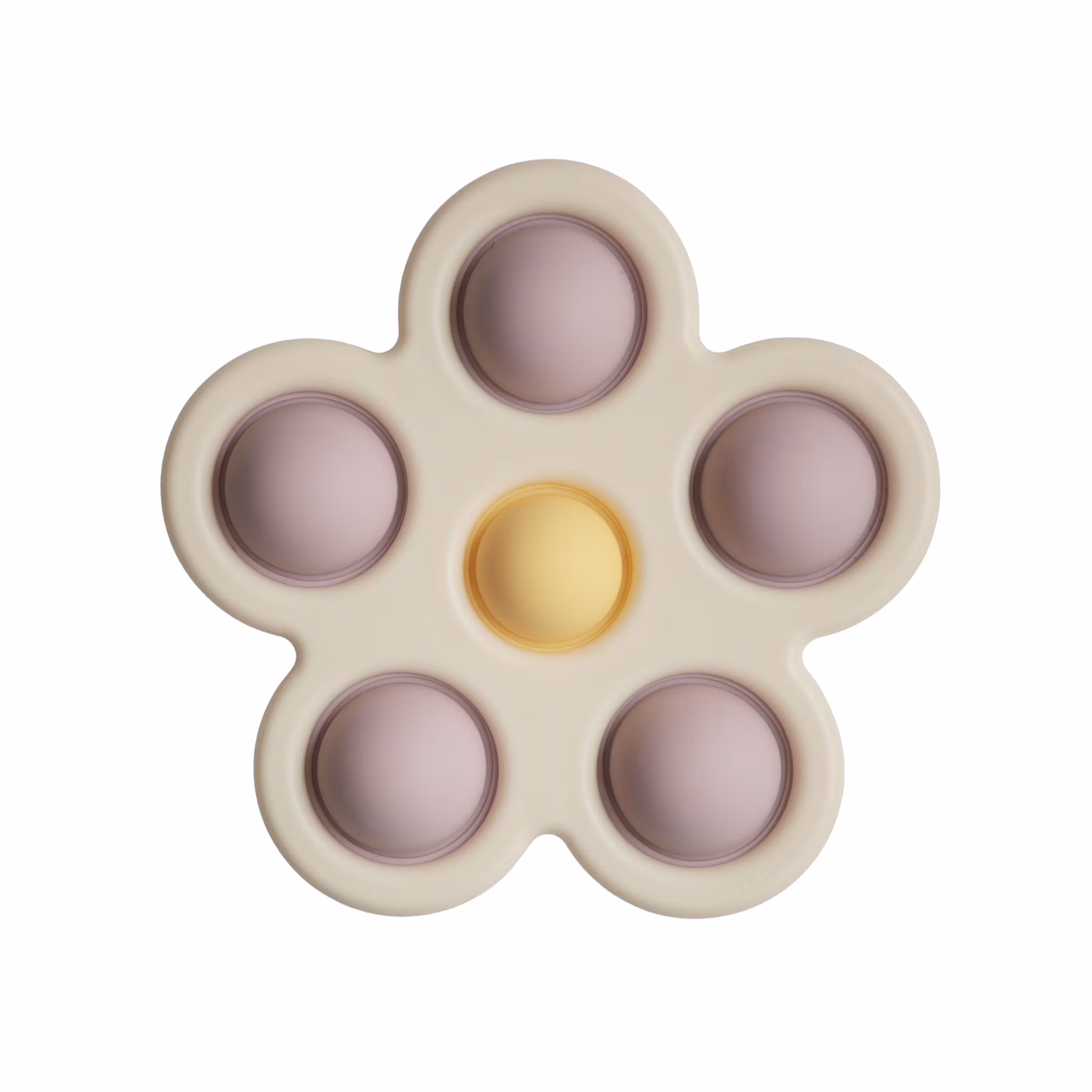 Pressleksak designad som en blomma med tryckknappar. Framtagen för små händer att hålla och leka med, från 10+ månader. Leksaken främjar finmotorik och uppmuntrar sensorisk utforskning med bubblor som kan tryckas om och om igen. Även bra till att lära sig siffror. Bubblorna är gjorda av livsmedelsgodkänd silikon. Denna sensoriska leksak ger oändliga timmar av nöje för de små. Perfekt på resan!